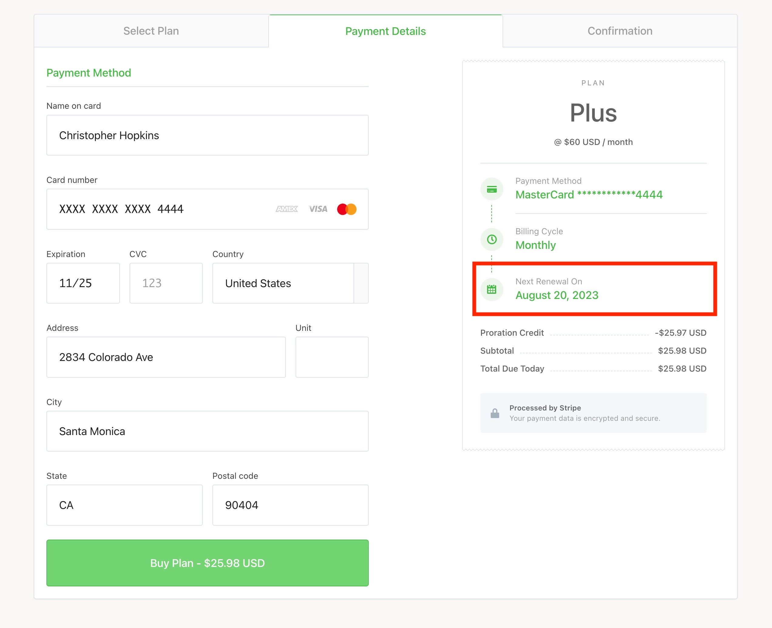 When purchasing (or upgrading) a plan we always display the "Next Renewal On" date within the Payment Details. This is the next time your credit card will be charged once you've successfully completed your purchase.