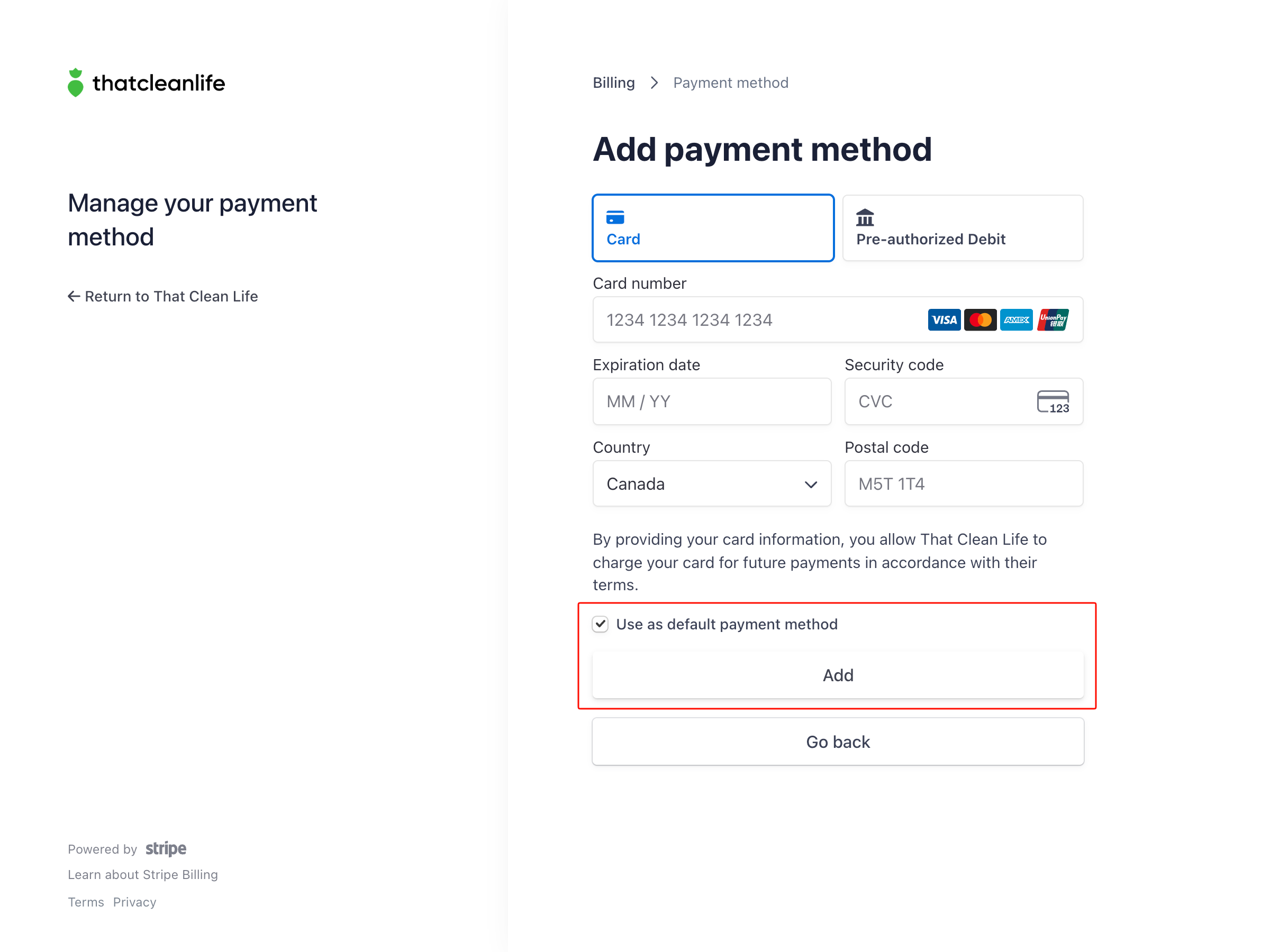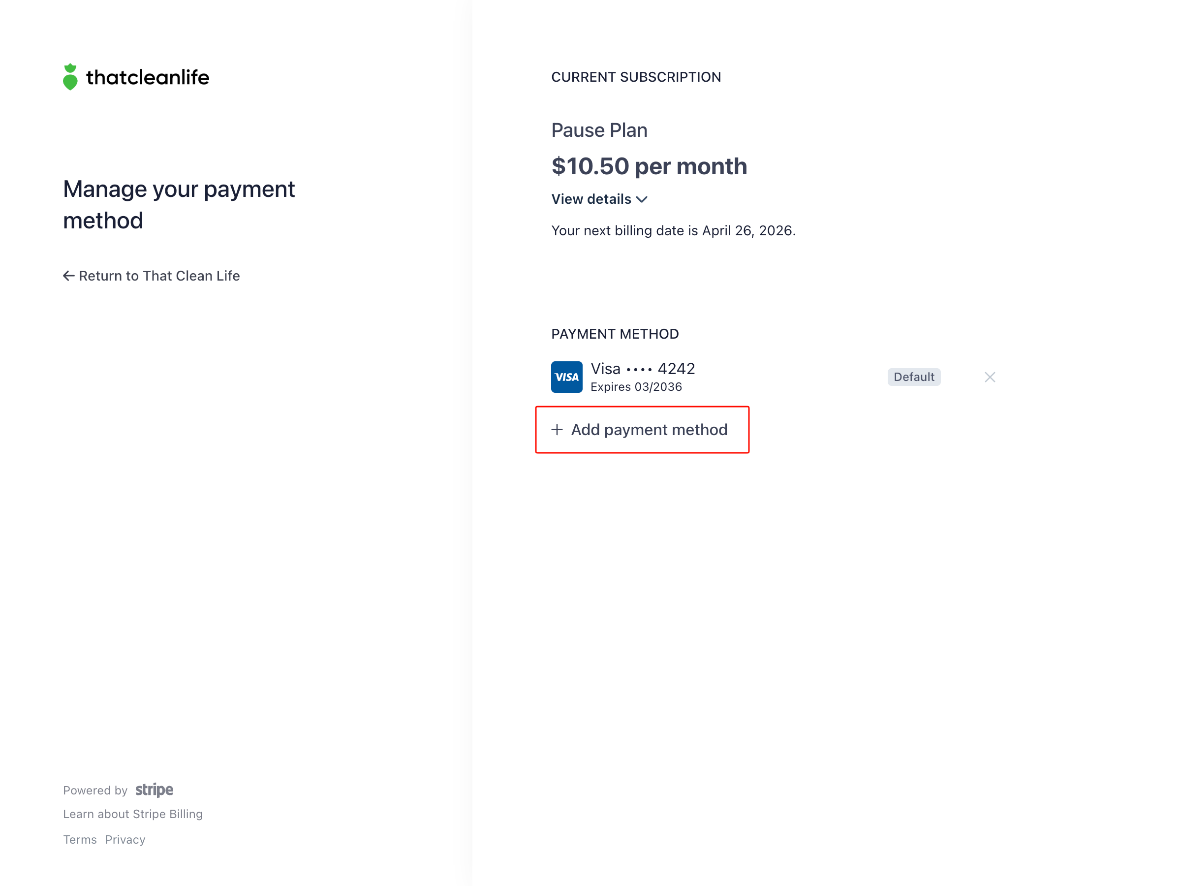 Clicking this button will let you manage your saved payment method for your That Clean Life subscription. Click the +Add payment method button.