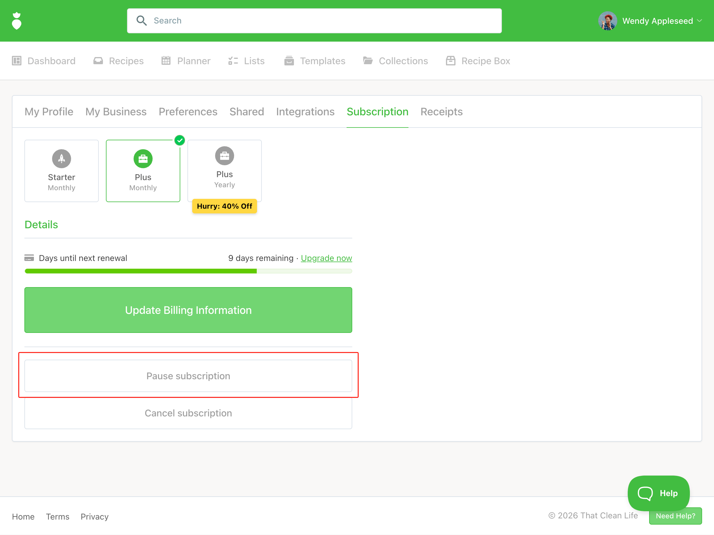- Select your desired subscription plan. Your subscription details will be updated and you’ll receive an email confirmation. If you do not receive a confirmation email please reach out to support@thatcleanlife.com.