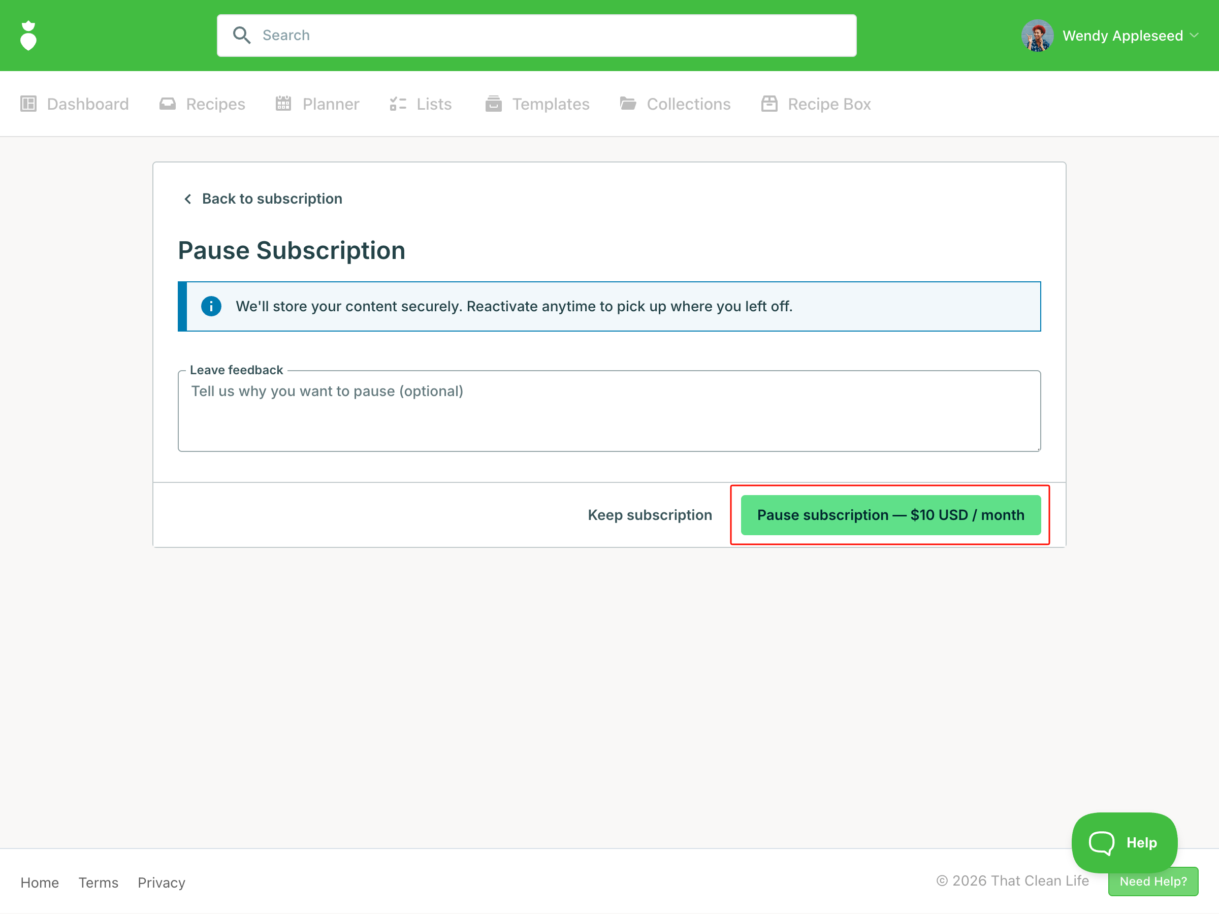 Let us know why you’re choosing to Pause your plan. Click the Pause subscription button.