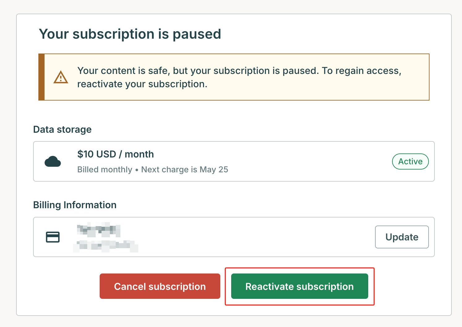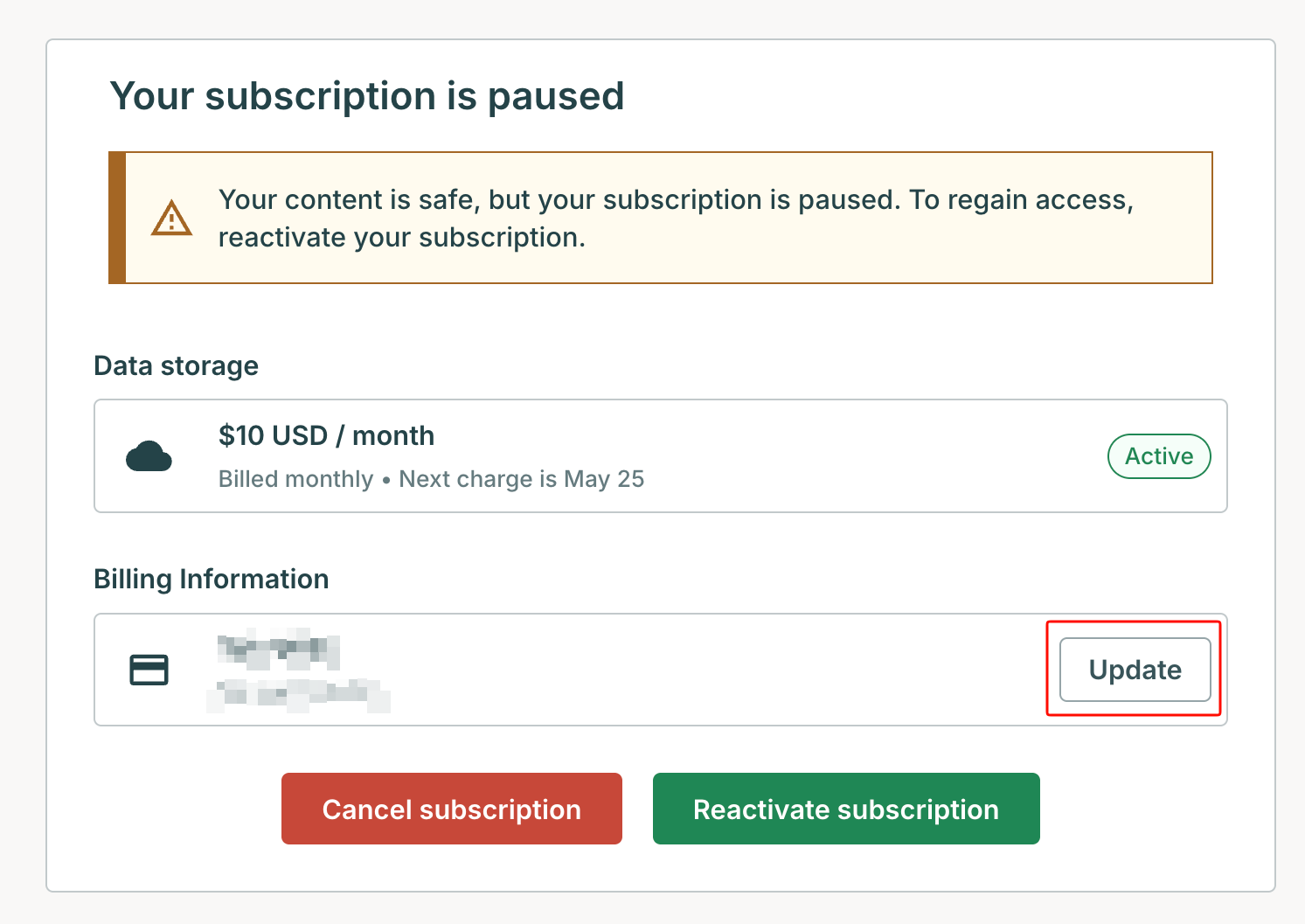 You’ll be brought to a page that says, “Your subscription is paused.” Click the “Update" button next to your Billing Information.