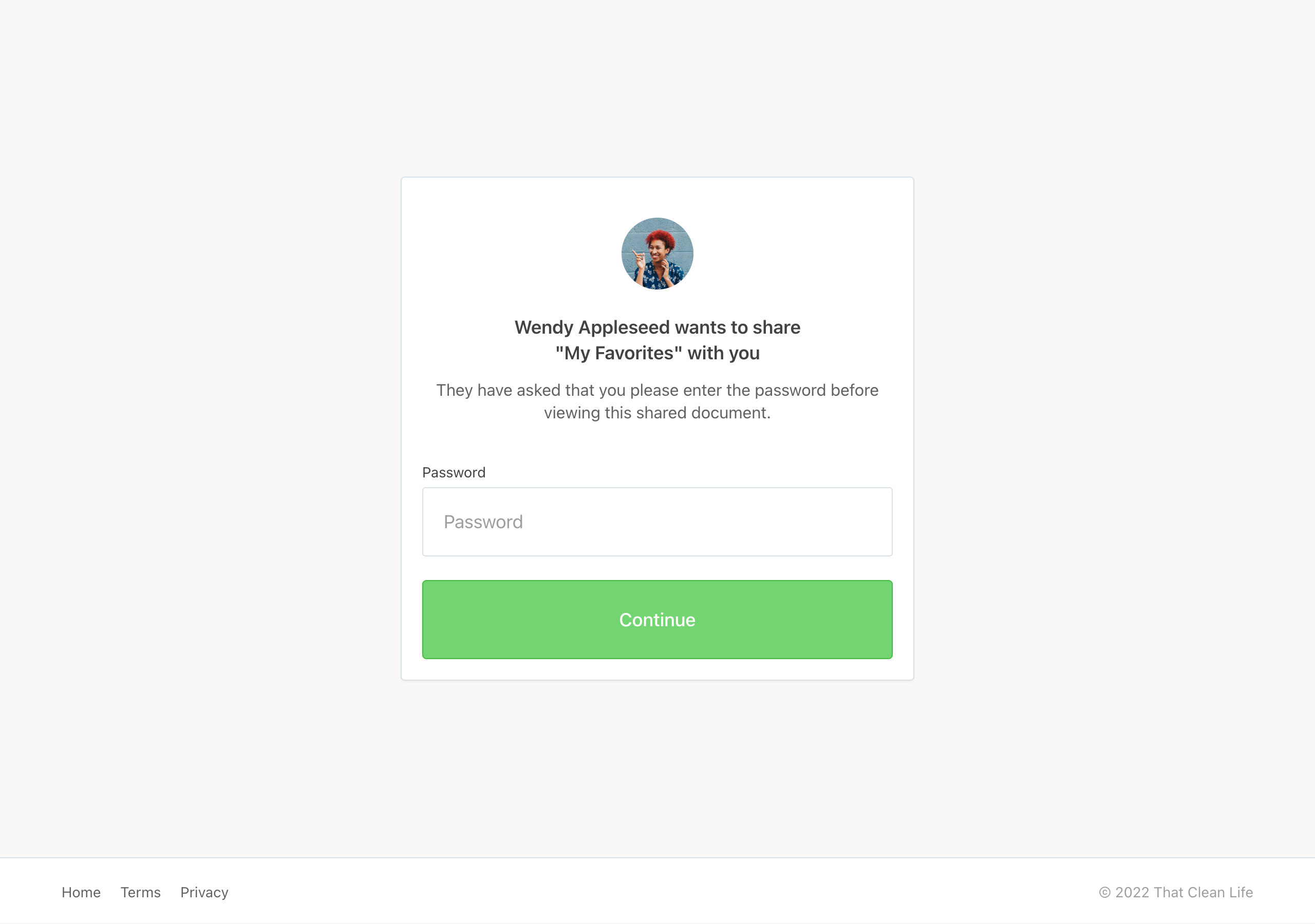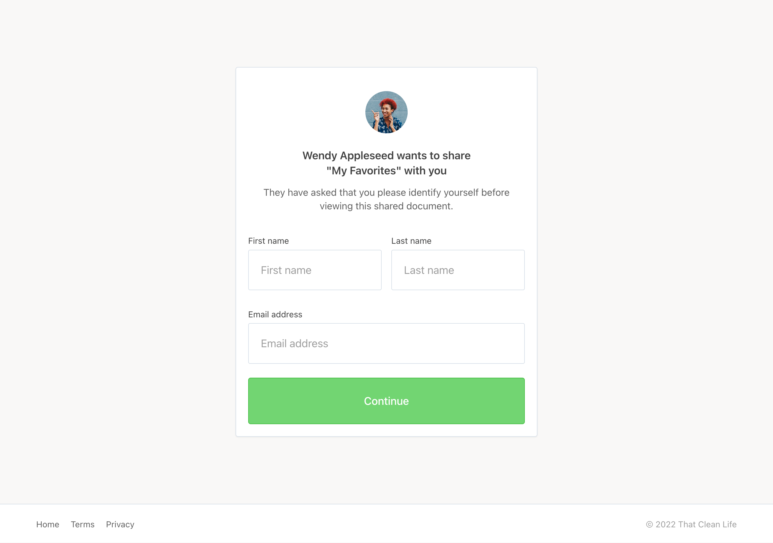 User Identification: People are required to identify themselves. This feature does not require the person accessing your share link to have a That Clean Life account — it is simply a way for them to identify themselves to you when viewing the link. Review who has accessed your shared link by viewing your Share Stats.