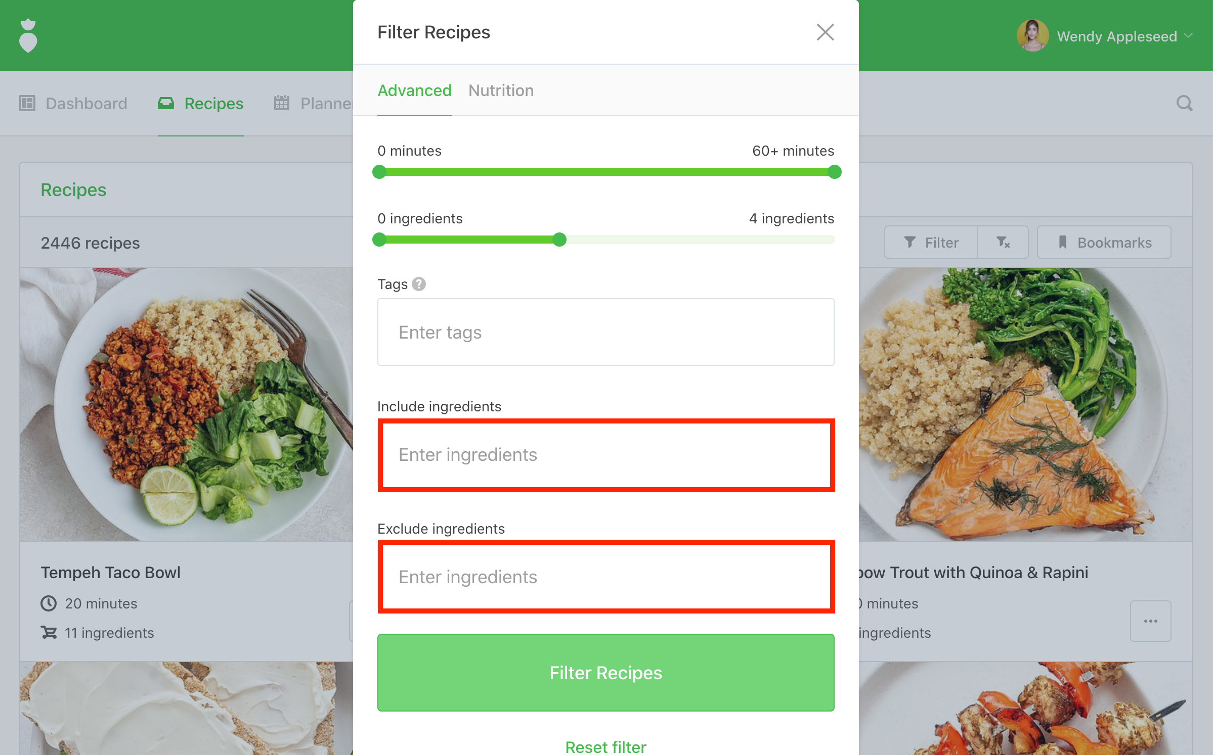 To filter recipes based on ingredients to include or exclude: