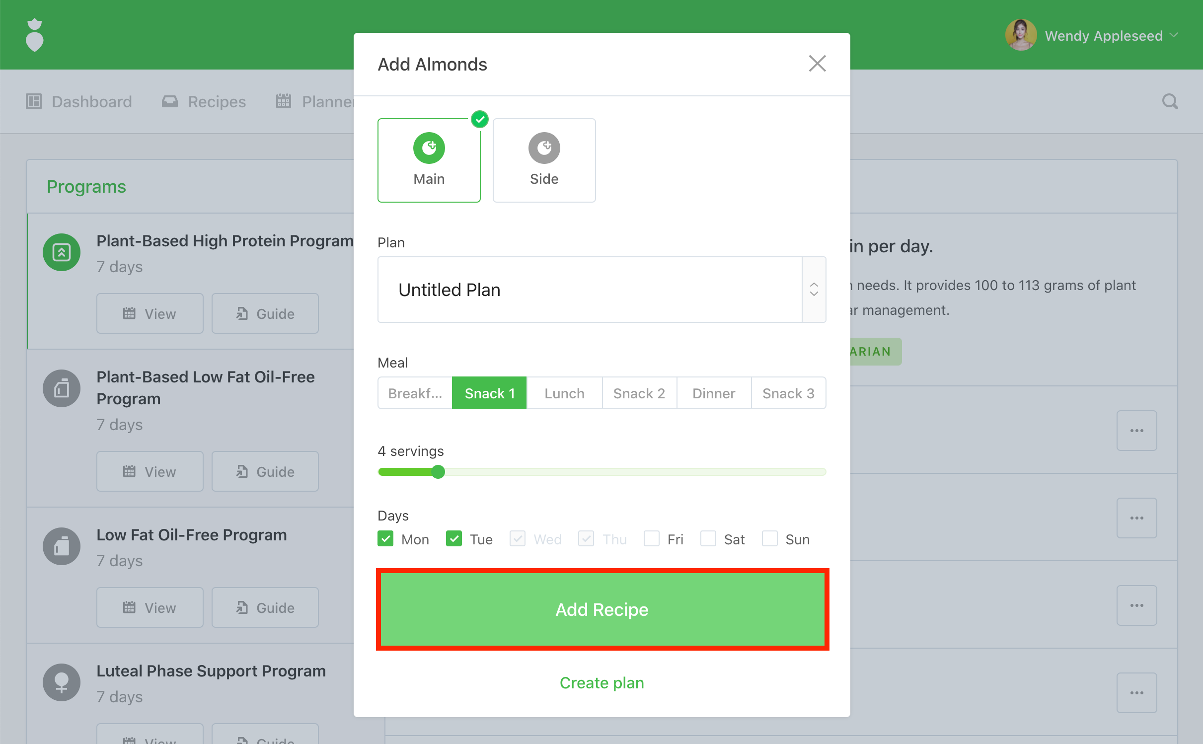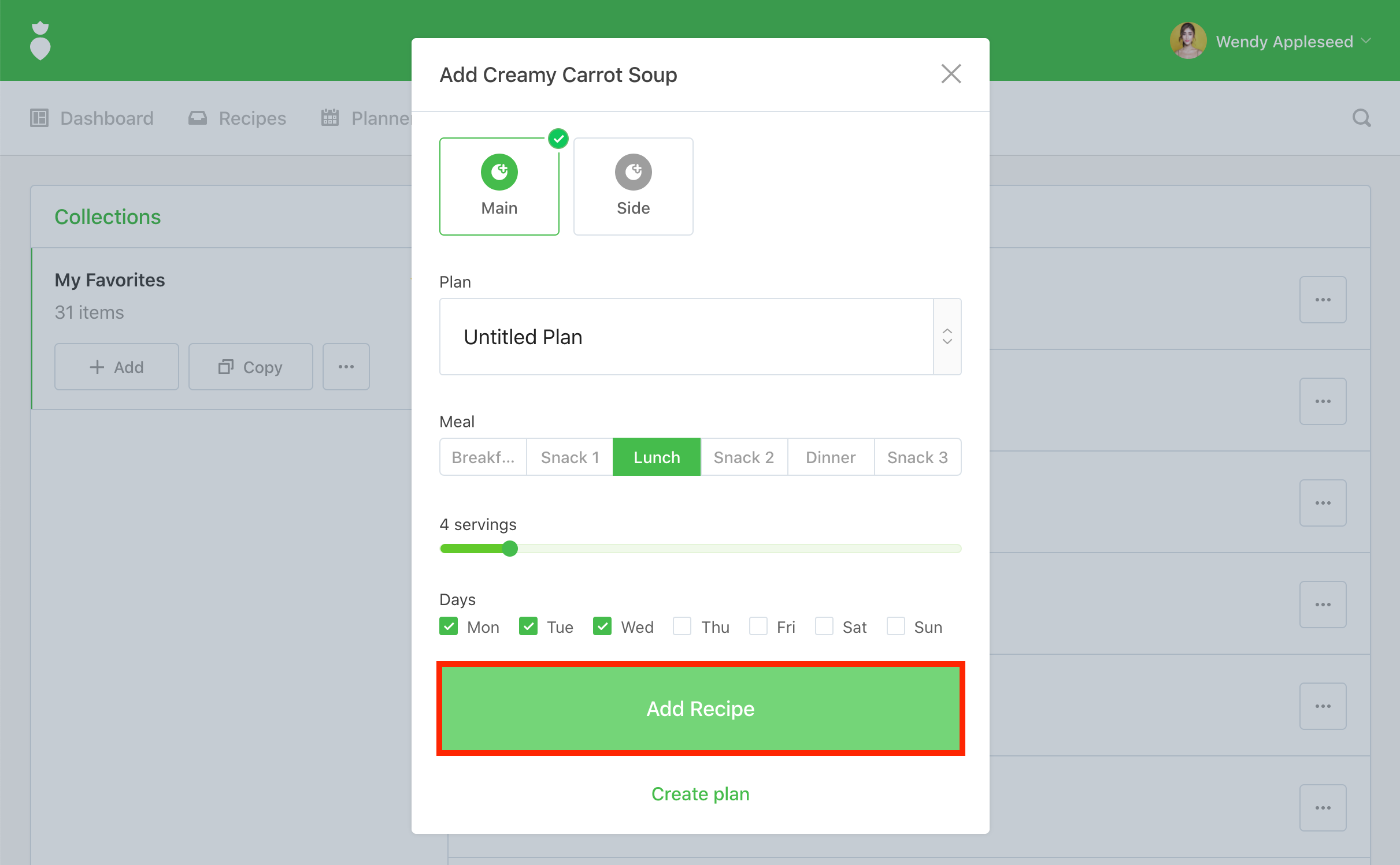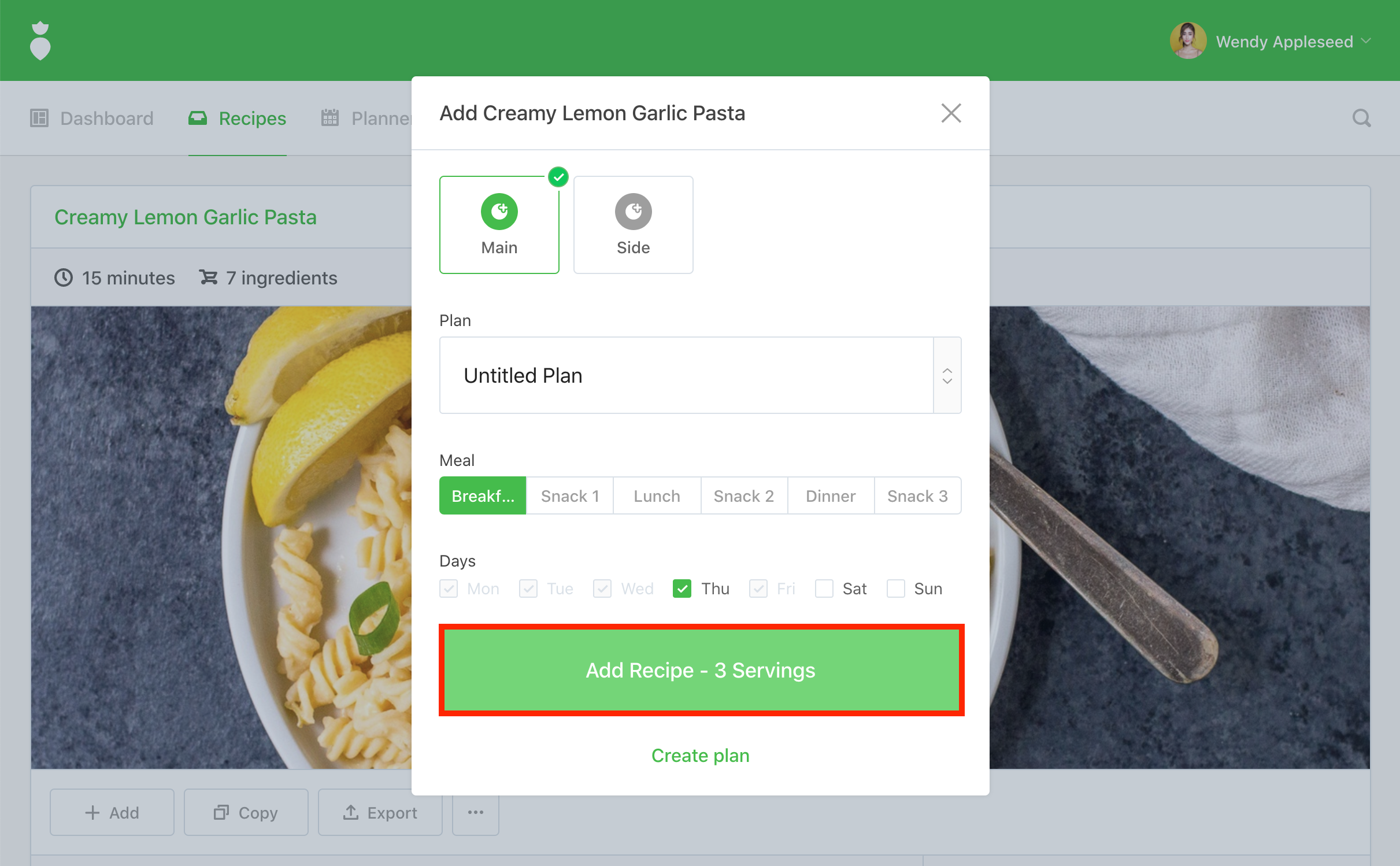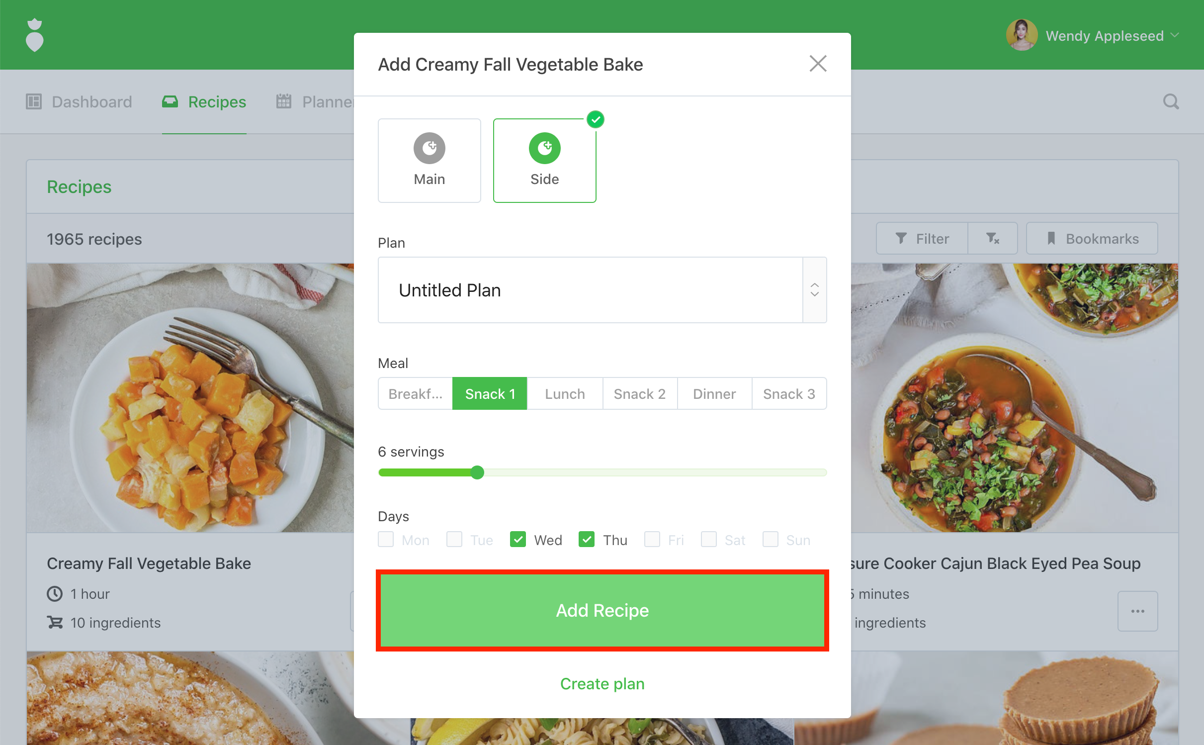 You'll be prompted by the "Add" dialog. Select "Main" or "Side", "Plan", "Meal", "Servings", and "Days". When you're ready click the Add Recipe button: