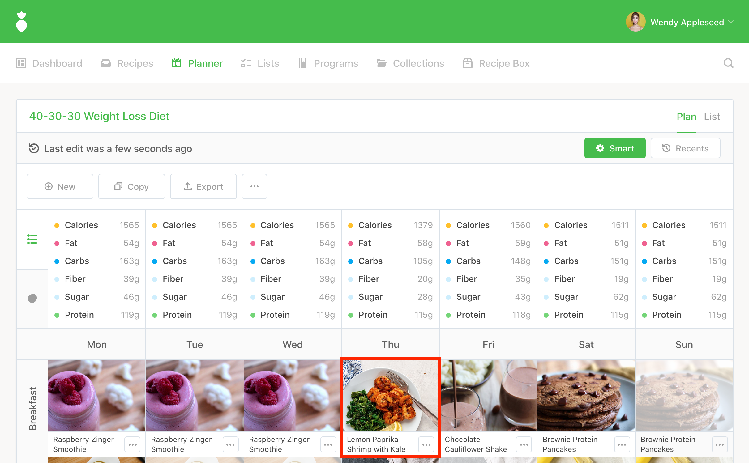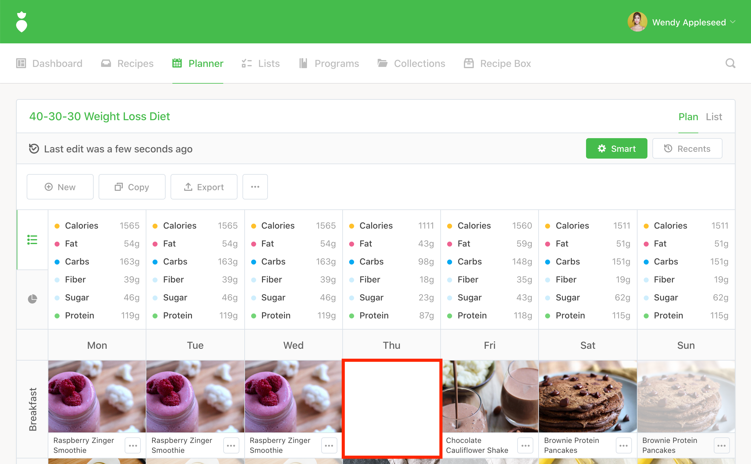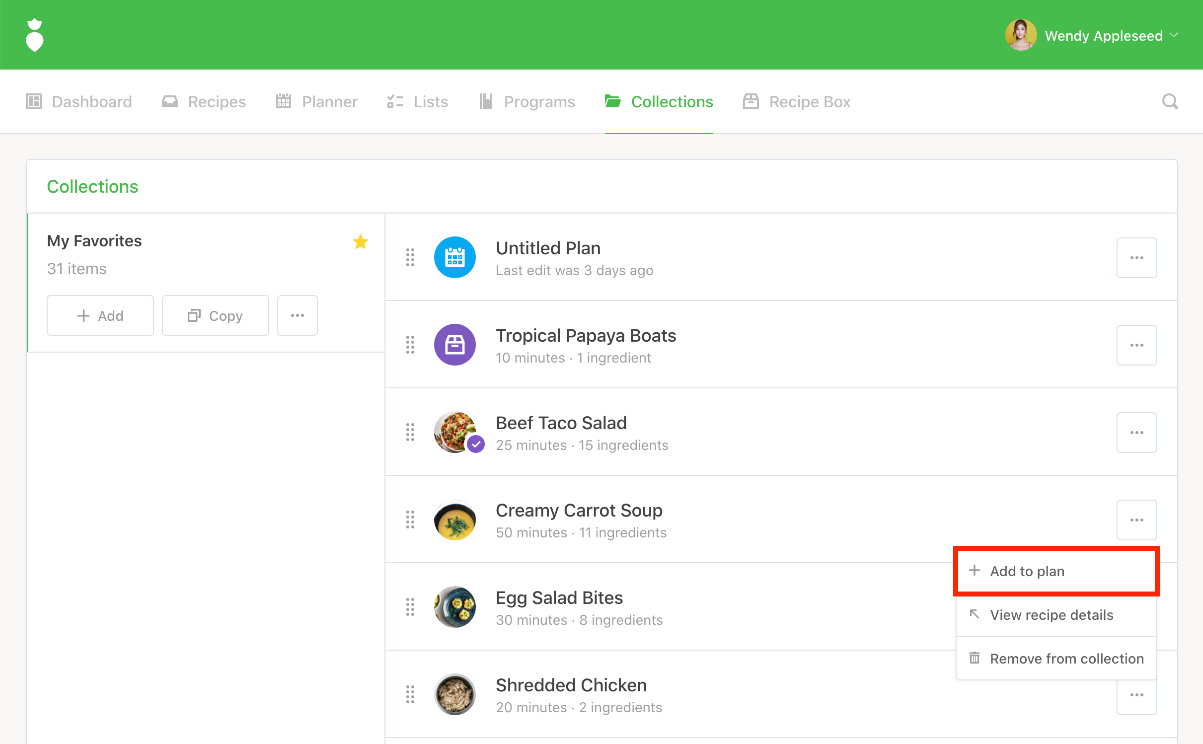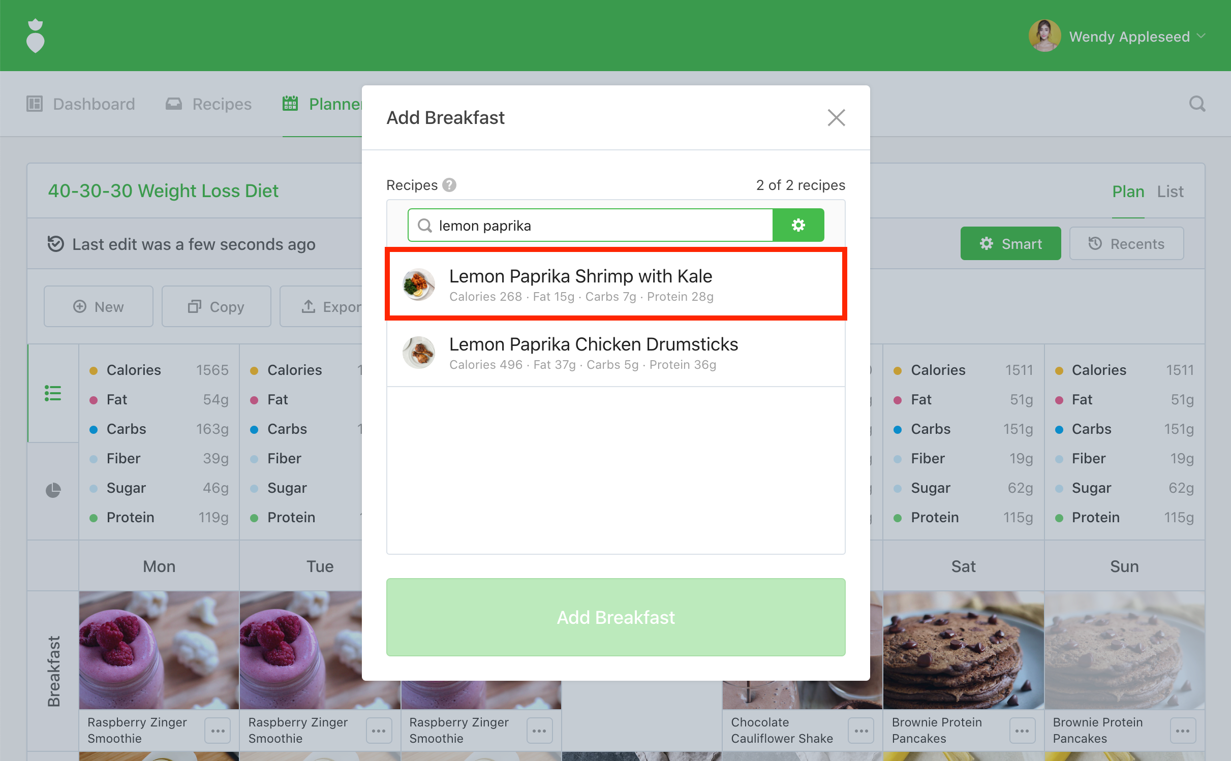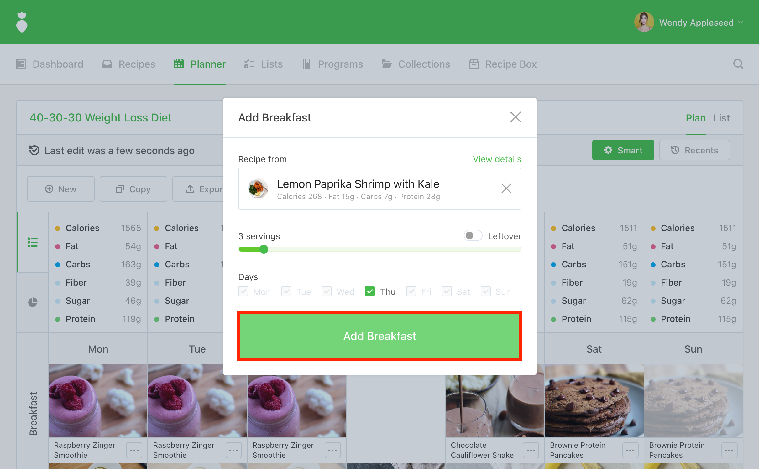 Note: We auto-select the most recent Plan you've edited but you're free to change it. Any "Days" that are disabled indicate that another recipe has already taken that spot in your plan.