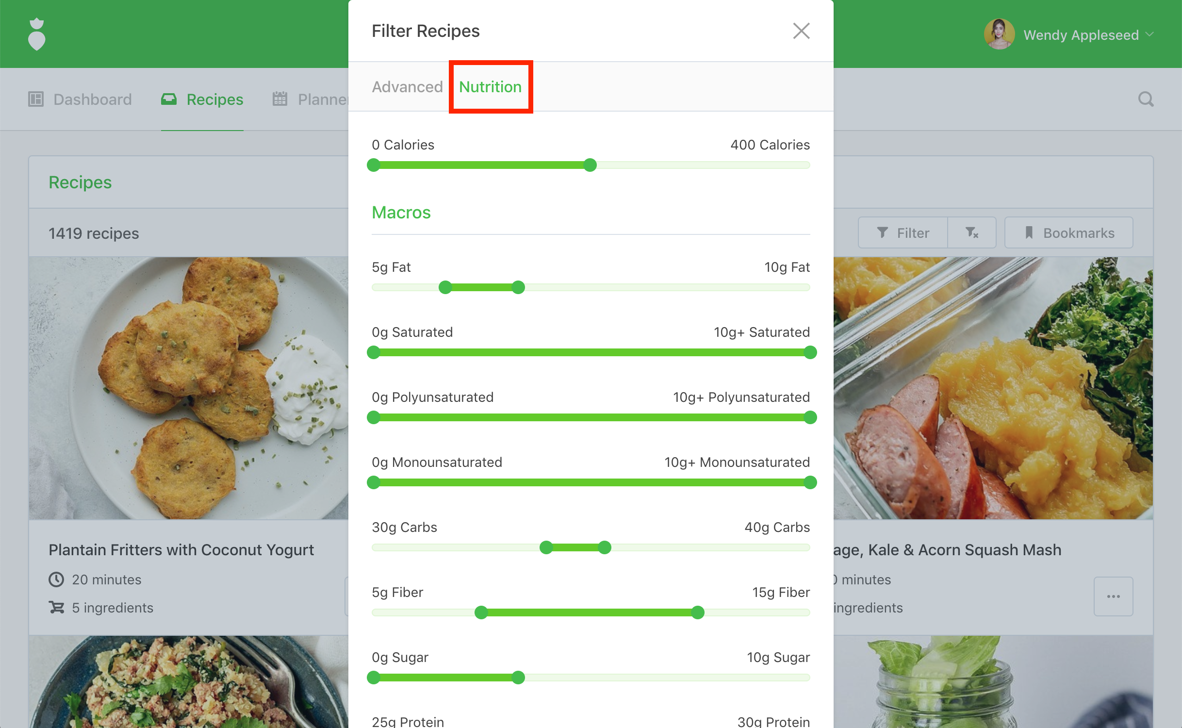 You'll be prompted by the "Filter Recipes" dialog. Next, click on the Nutrition tab near the top of the dialog. From here, you can filter for meals based on nutrition facts.