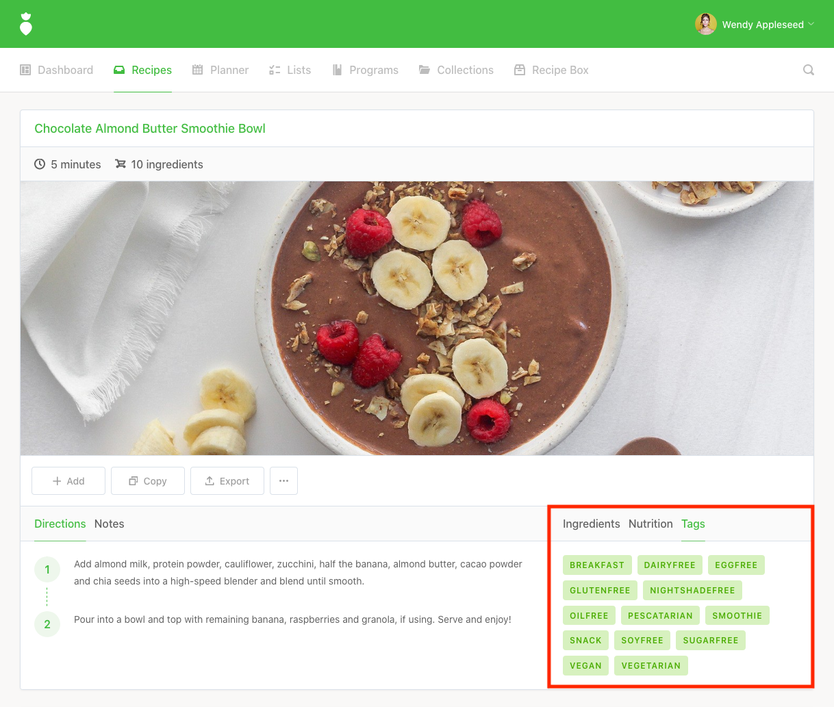 We list all the tags that apply to each of our Recipes and those added to your Recipe Box. View a recipe and simply click Tags to the right of Nutrition to view all related tags: