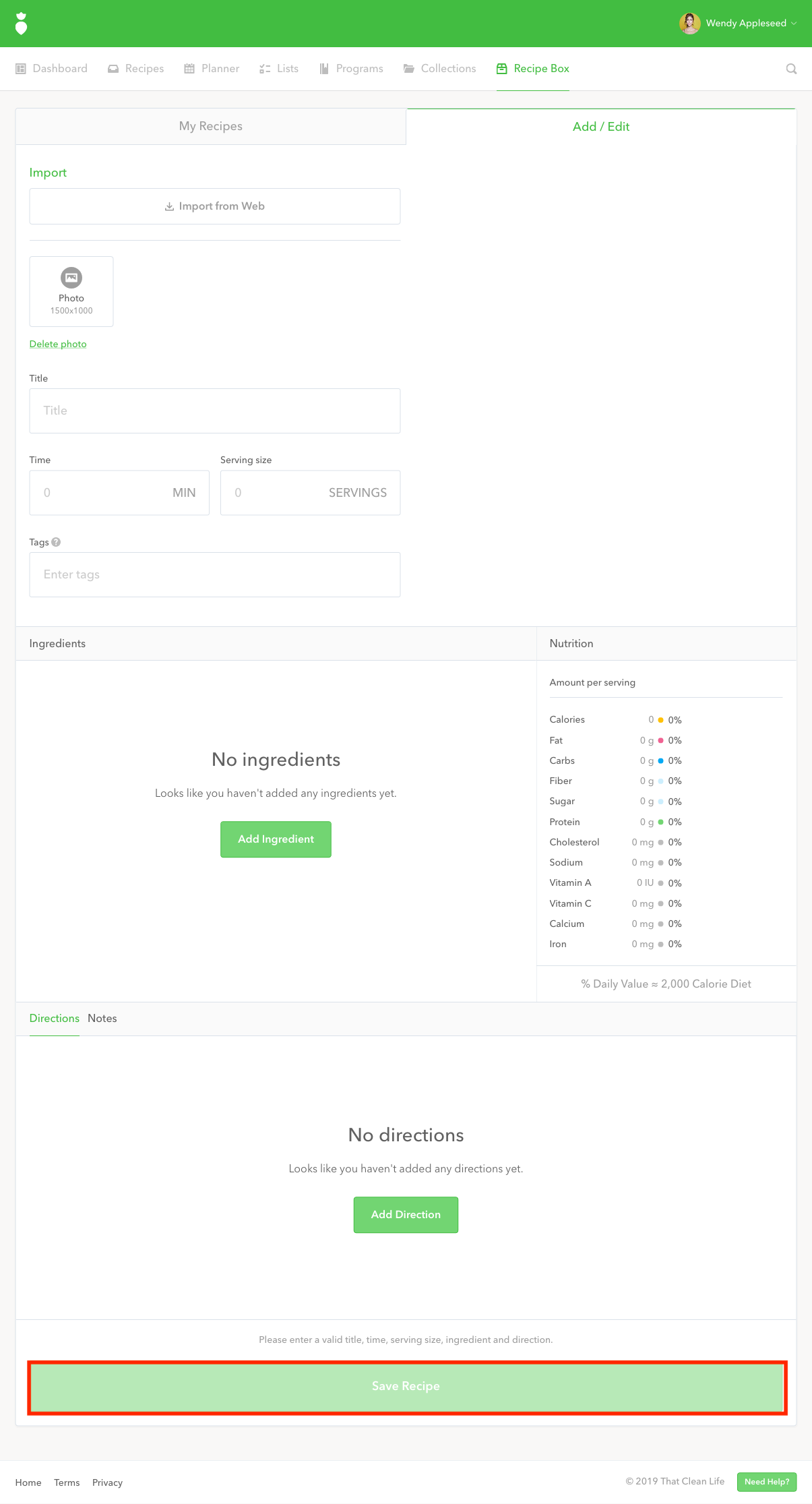 Note: A recipe requires a title, time, serving size, and at least one ingredient and direction before it can be successfully saved to your Recipe Box. A photo is optional — we recommended a photo size of 1500px by 1000px (.jpg) with minimal whitespace for best results.