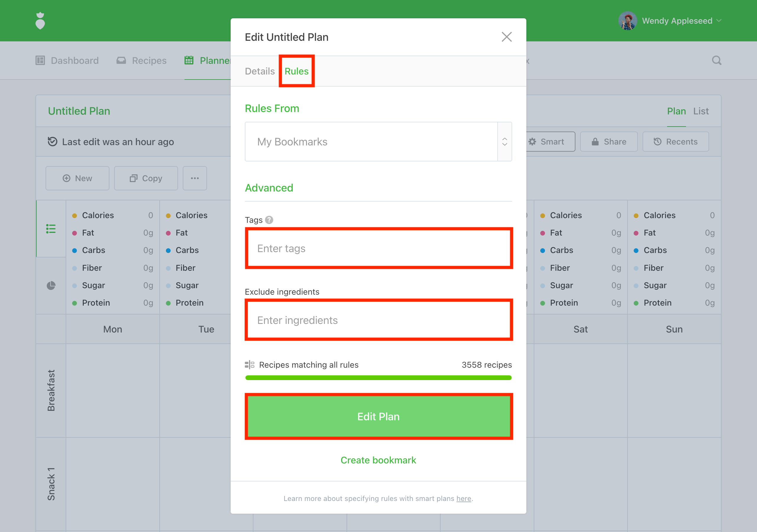 Note: It's kind of like creating a smart playlist instead of just a playlist. As you input different Rules you'll see the "Recipes matching all rules" update in real-time. This will give you a sense of the number of recipes available to you once these rules are applied to your plan.