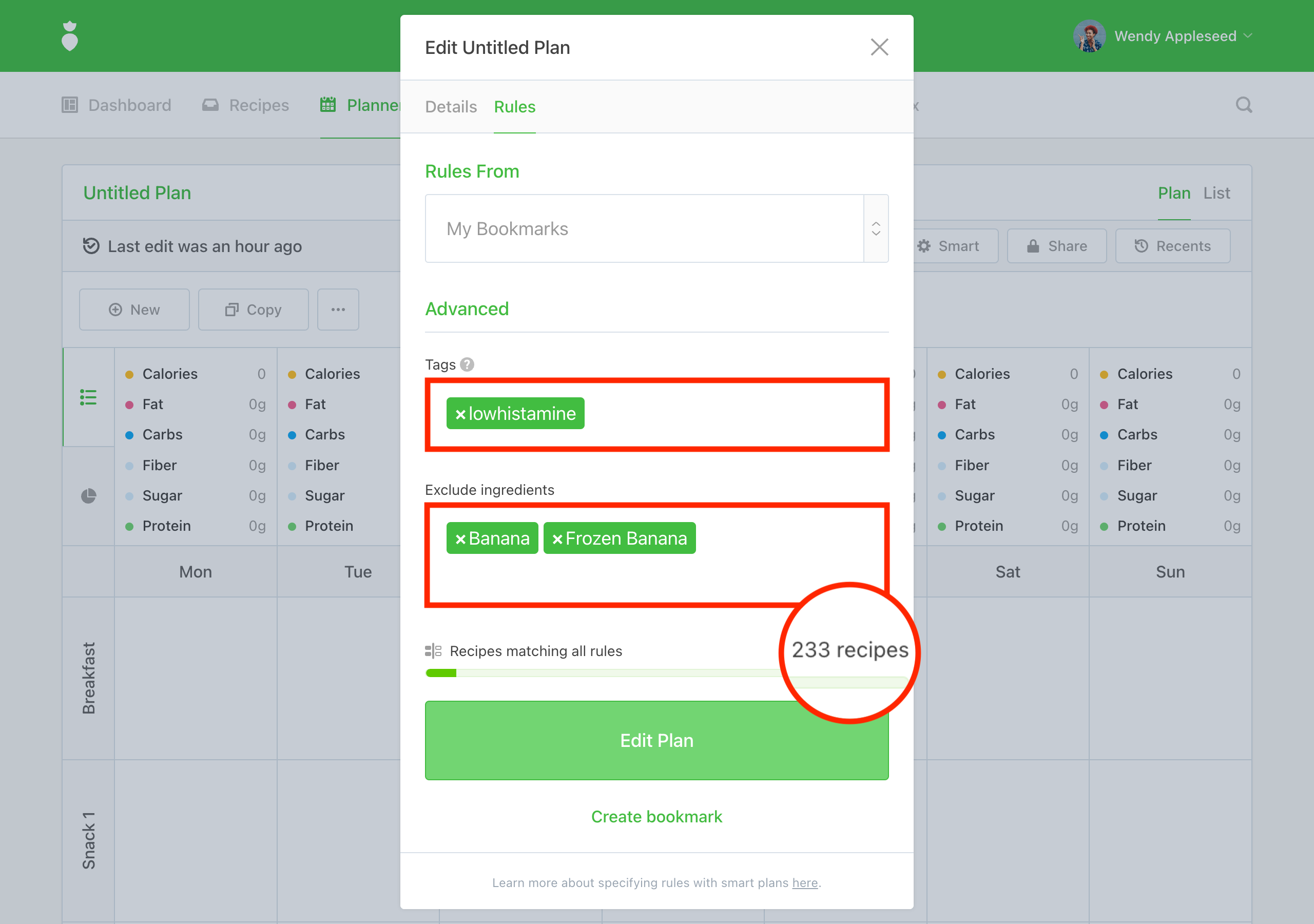 Note: At any time you can edit the Rules of your plan. This will change the recipes we display to you when adding meals to your Planner. It will have no impact on any existing meals already added to your plan.