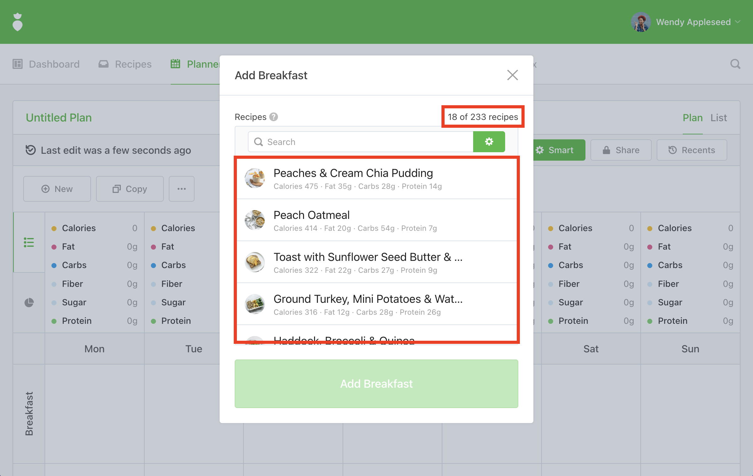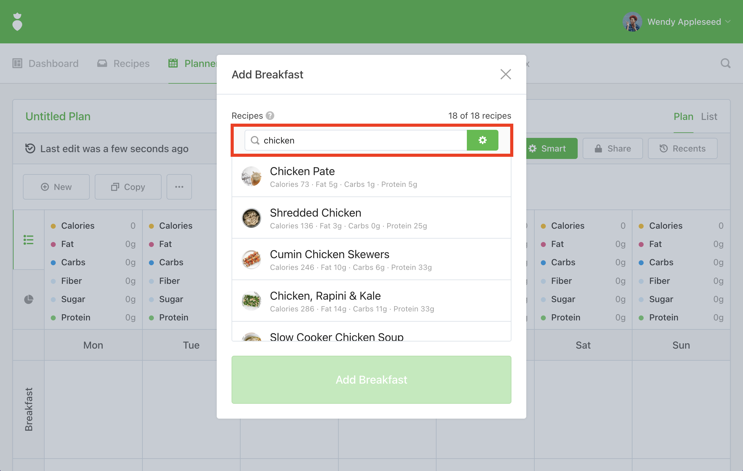 Start planning! You'll notice when adding meals to your plan that the recipes displayed take into consideration the