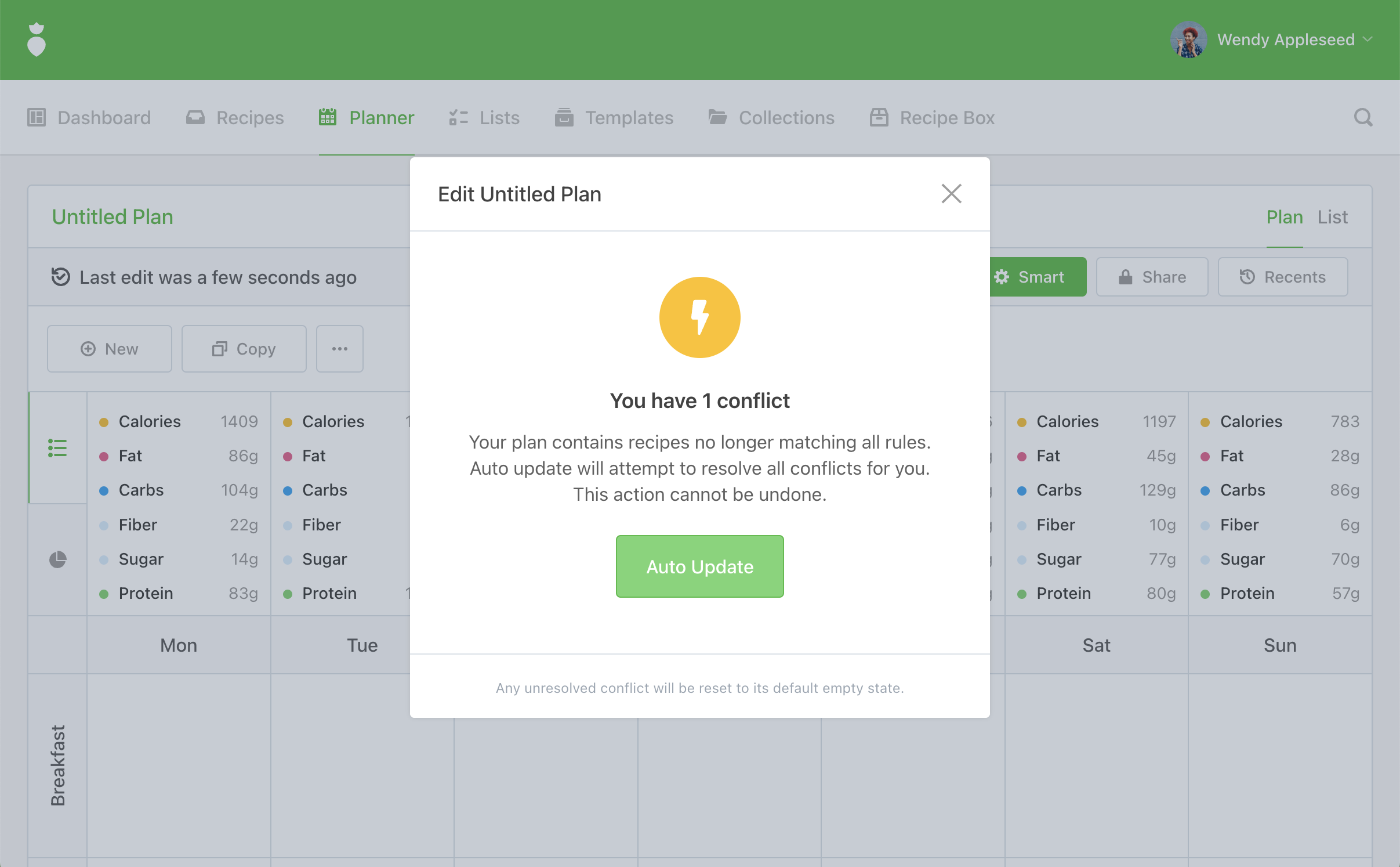 Note: If your subscription supports Automation, when Rules are updated the system will perform an audit against your existing plan and then present you with a modal if any conflicts have been detected. Clicking the Auto Update button will attempt to resolve all conflicts for you via swapping all conflicting recipes for compliant ones with similar characteristics.
