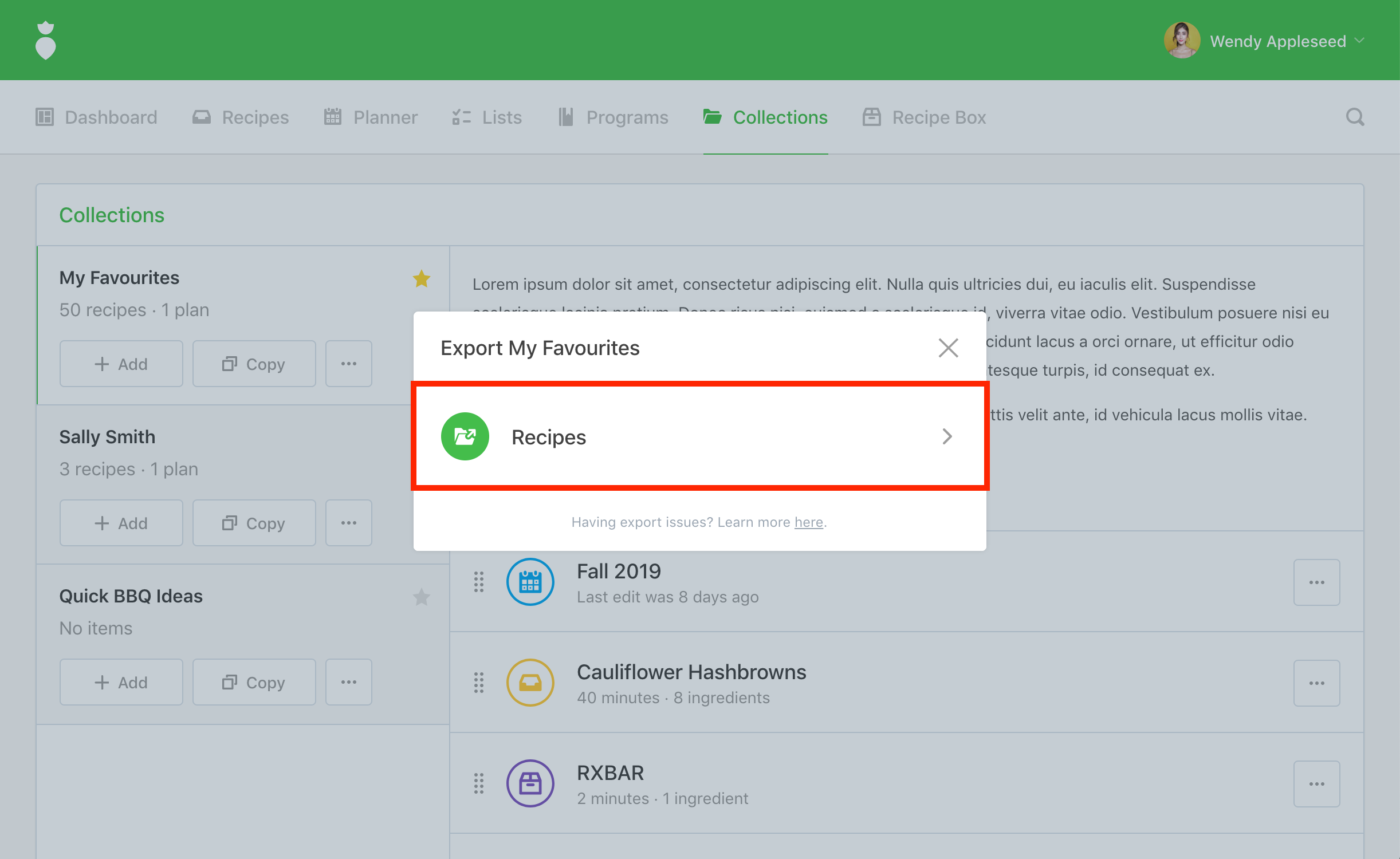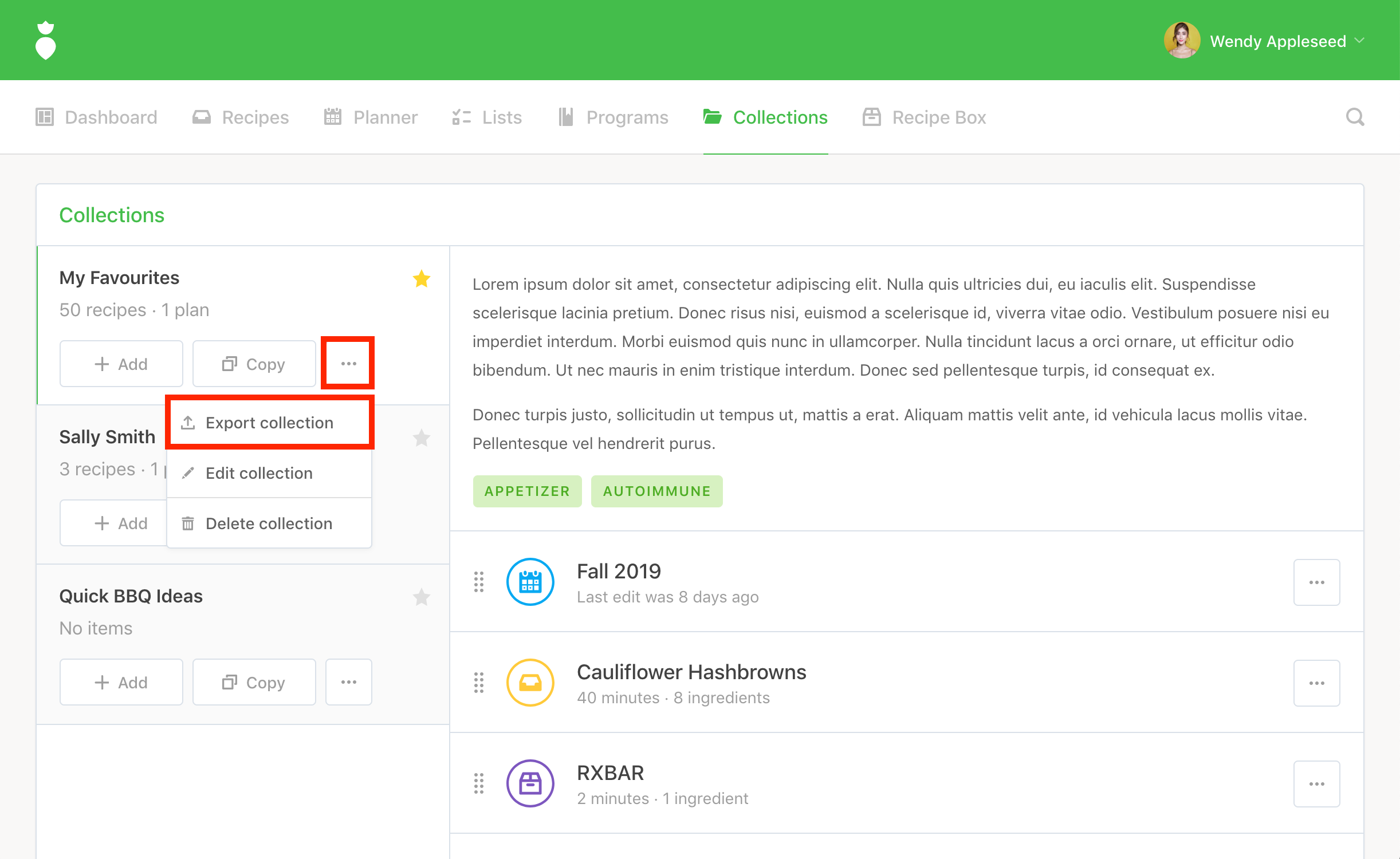 Use Collections to share or export a group of recipes with standard serving sizes without a grocery list.