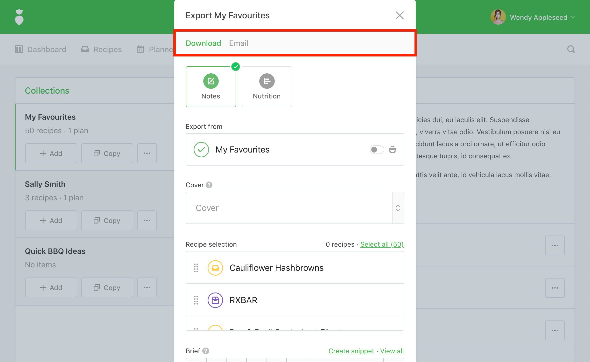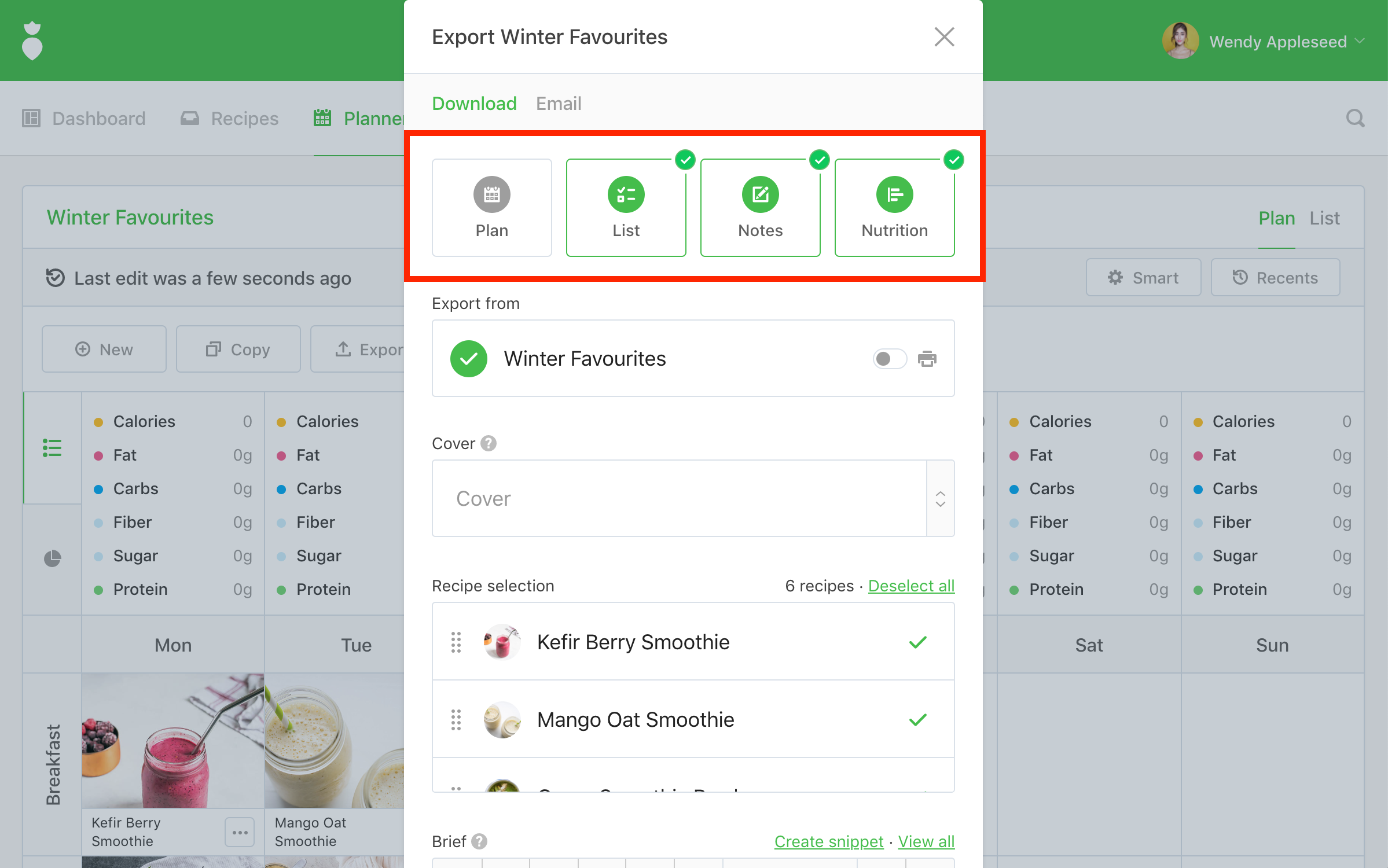 Use the Planner to export a recipe book with your chosen serving sizes and/or a grocery list.
