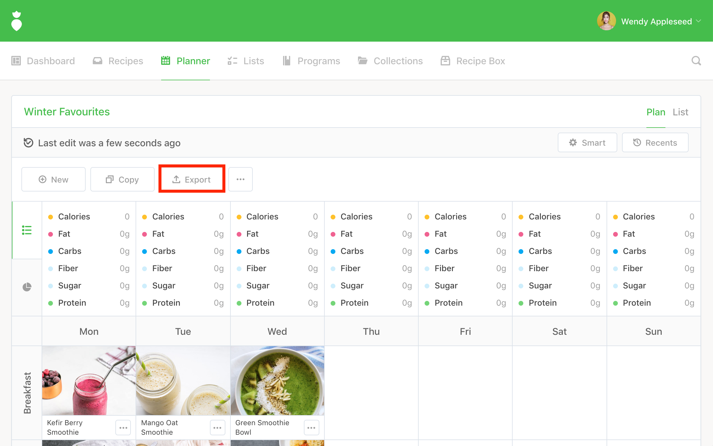 Once you've finished adding recipes to your plan and you are ready to export it, click the Export button: