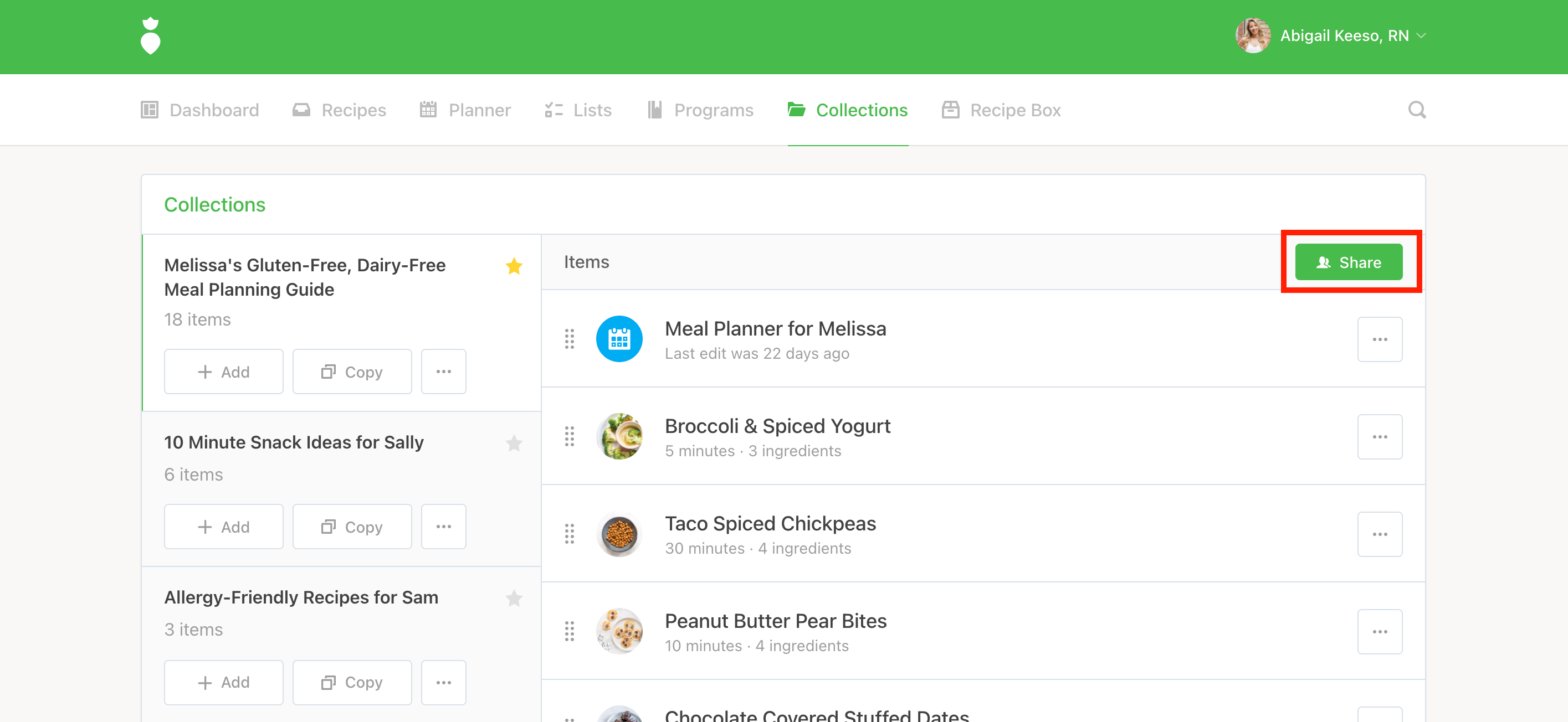 To share a Collection of recipes, click the Share button. Choose your share settings before copying the link to share with your client.