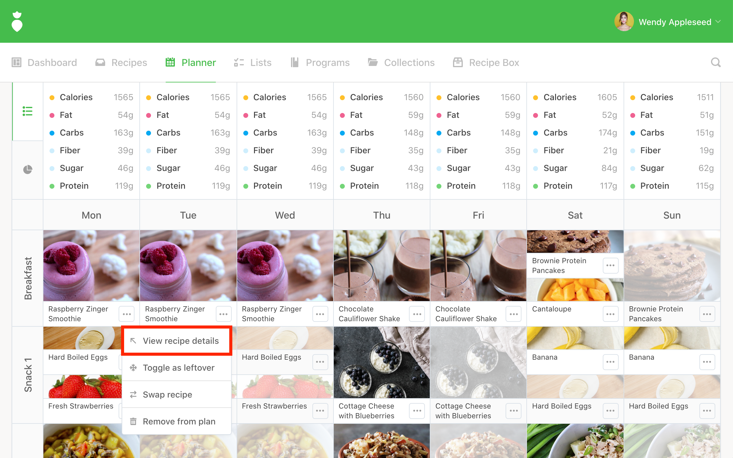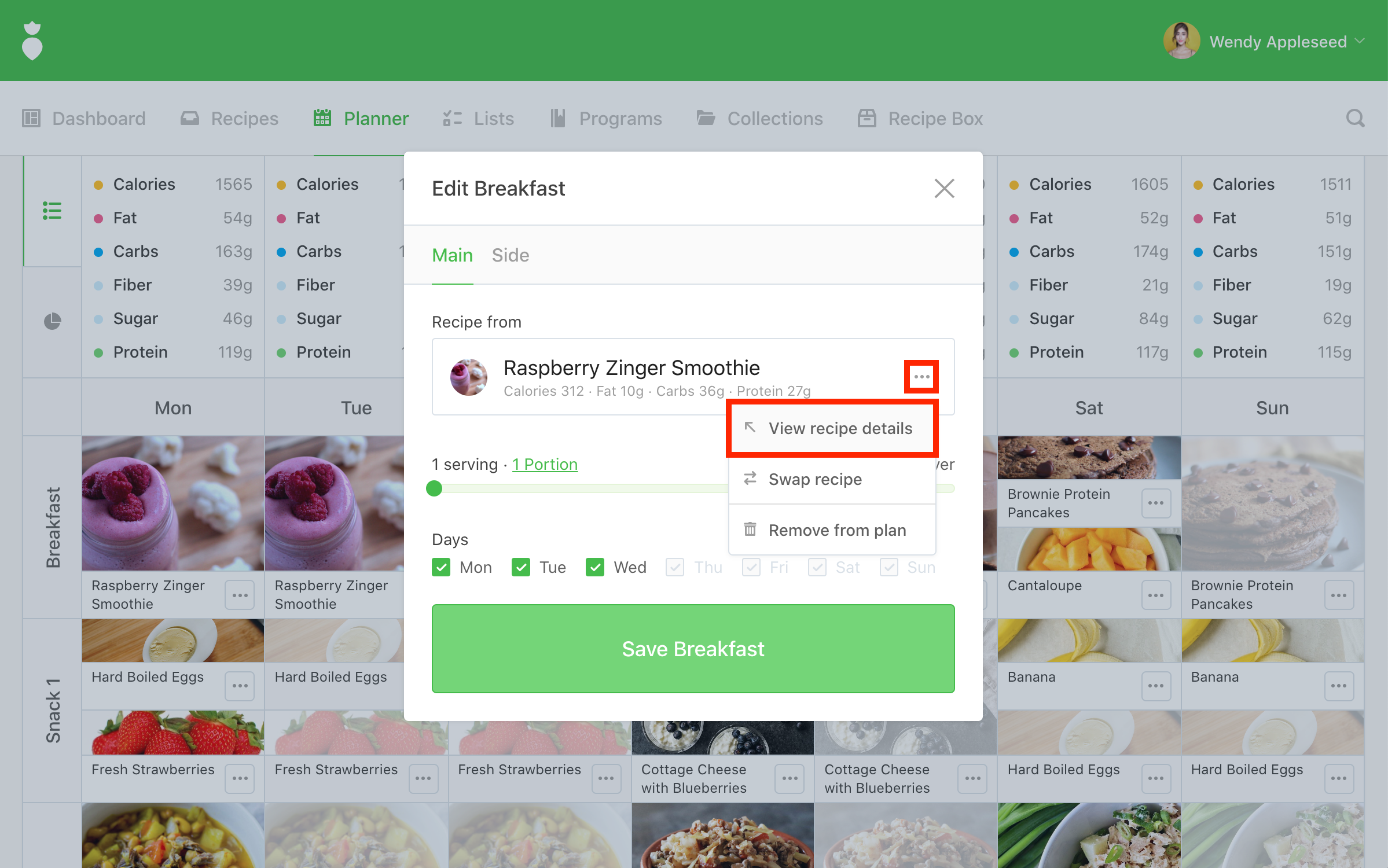From your Planner, click into any meal in which you'd like to view the recipe for, click on the ••• menu button, and then select View recipe details link: