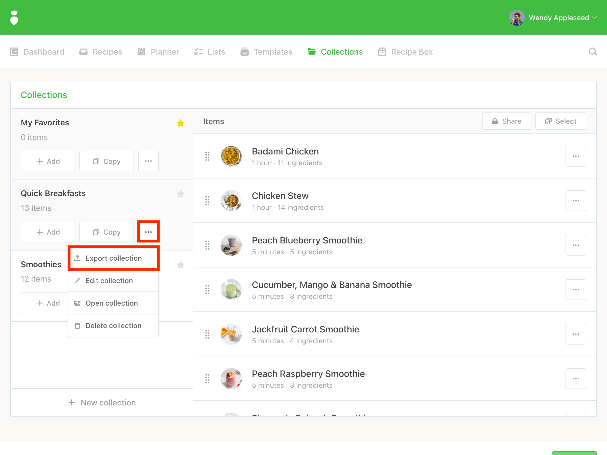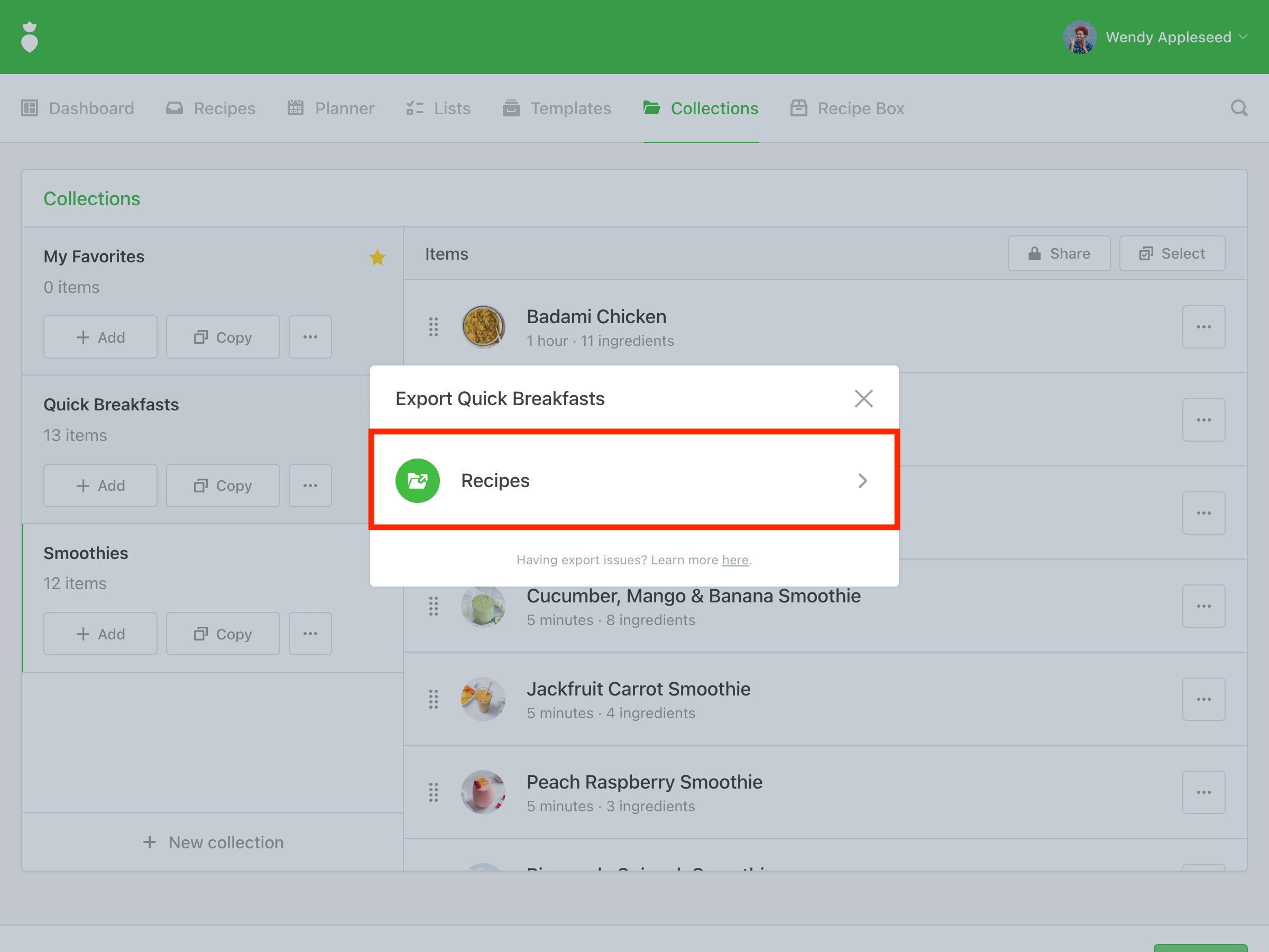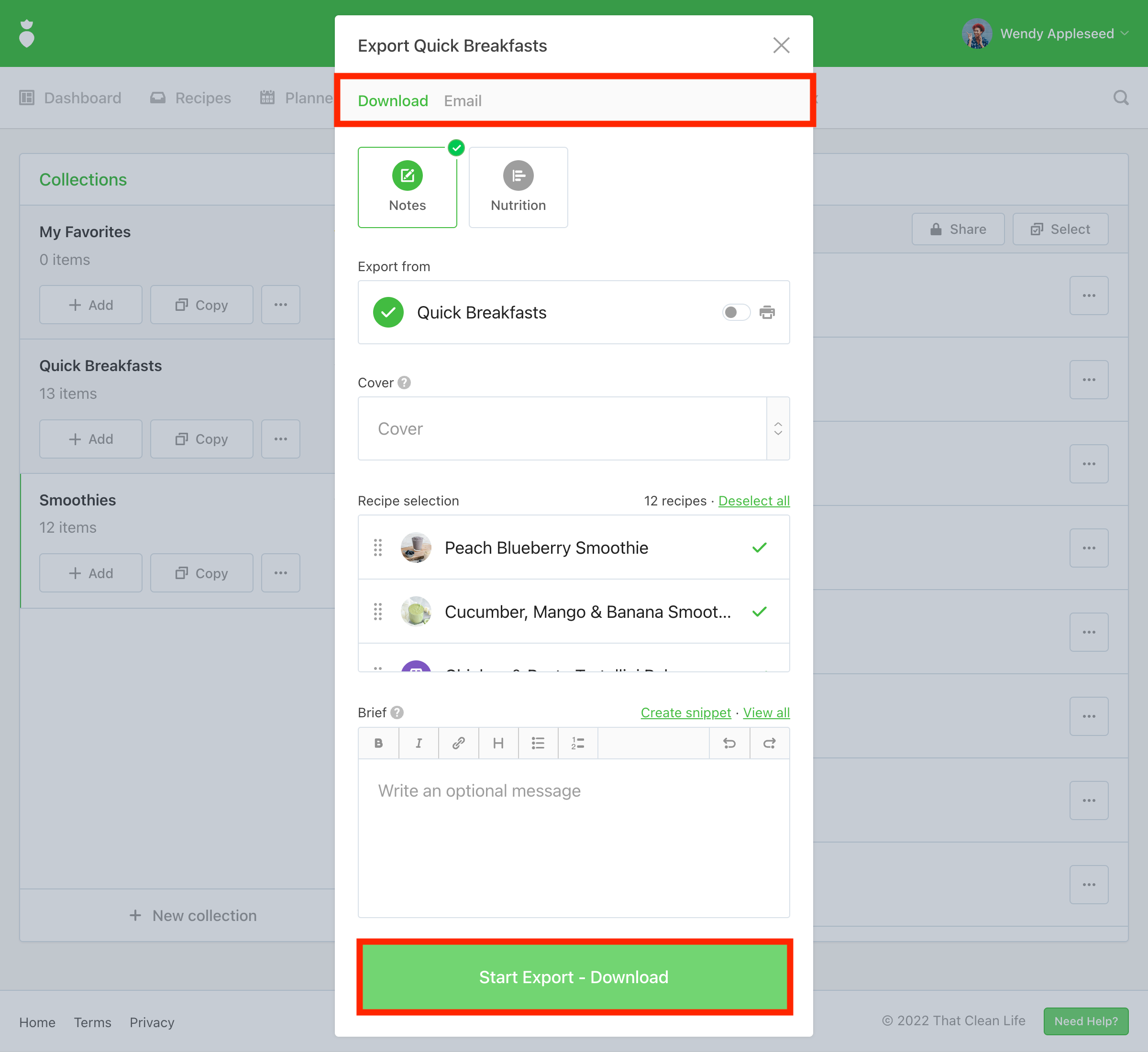 Collection exports are a great way to generate recipe books. These make great resources for a client or community who may not be into following a meal plan, but would prefer a book of your "approved" recipes to draw inspiration from.