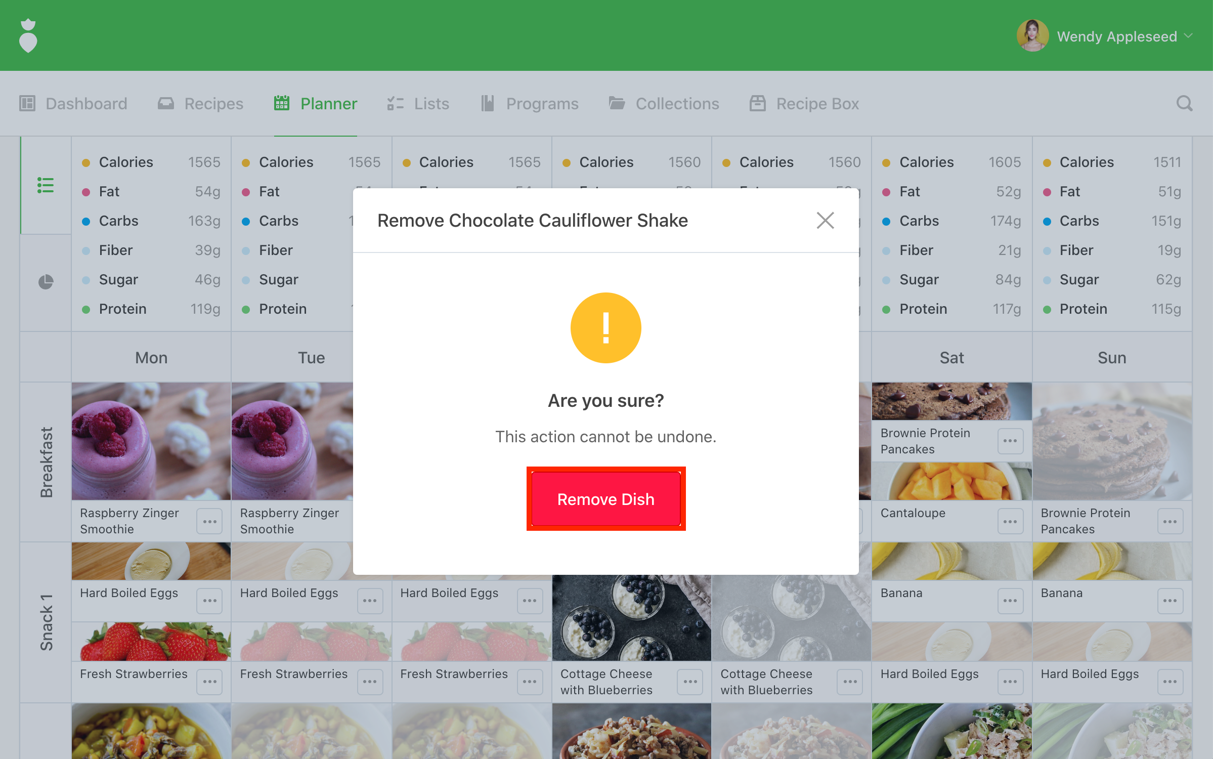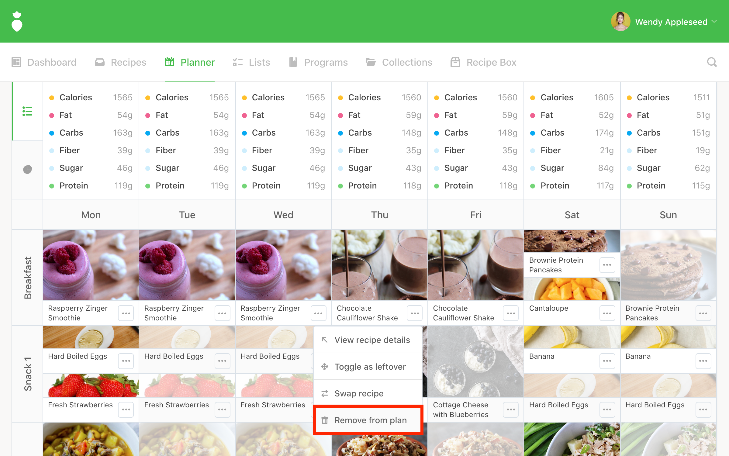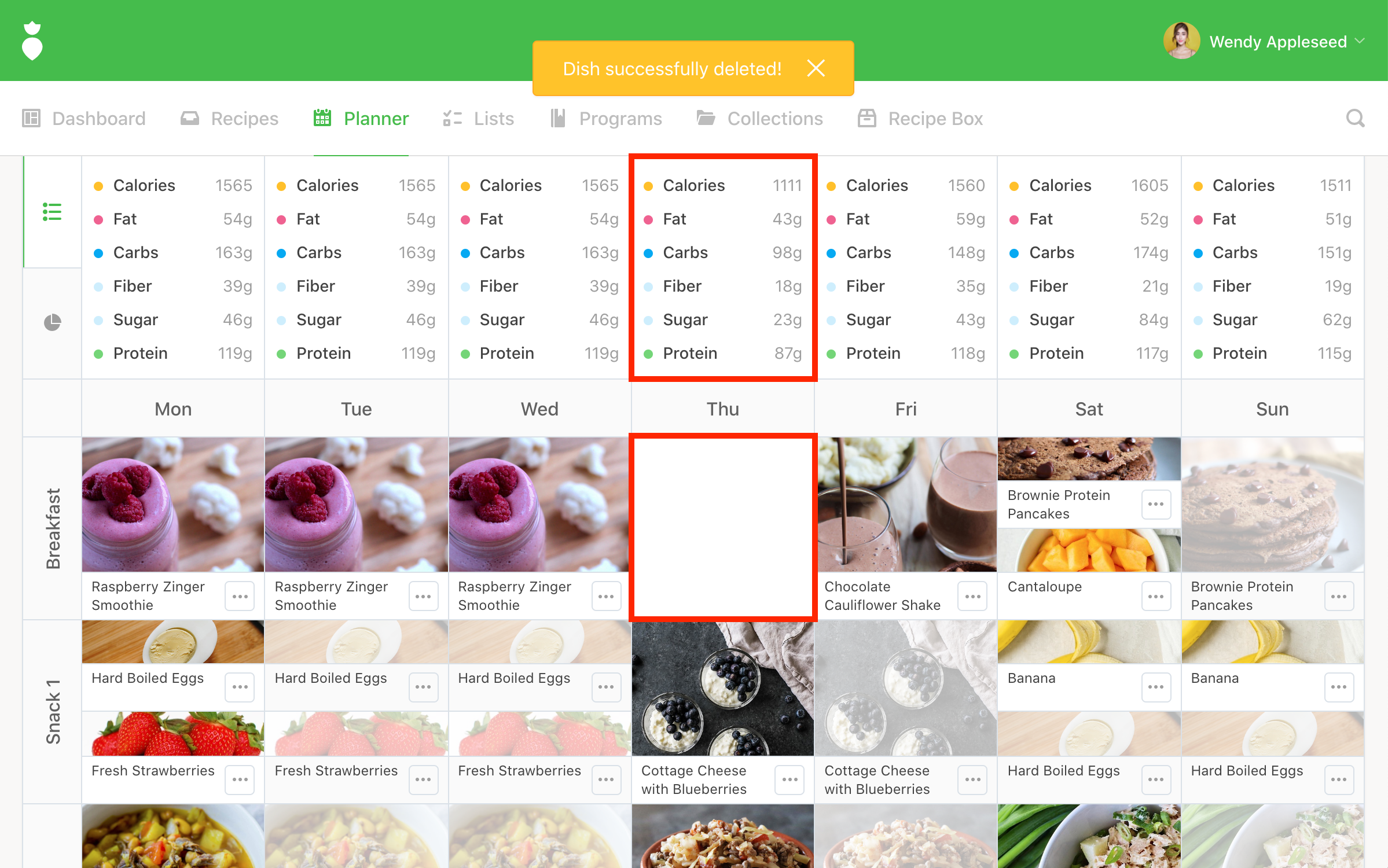 Voila! You've successfully removed a meal from your plan. The plan's nutrition for that day will be automatically updated to reflect the removal: