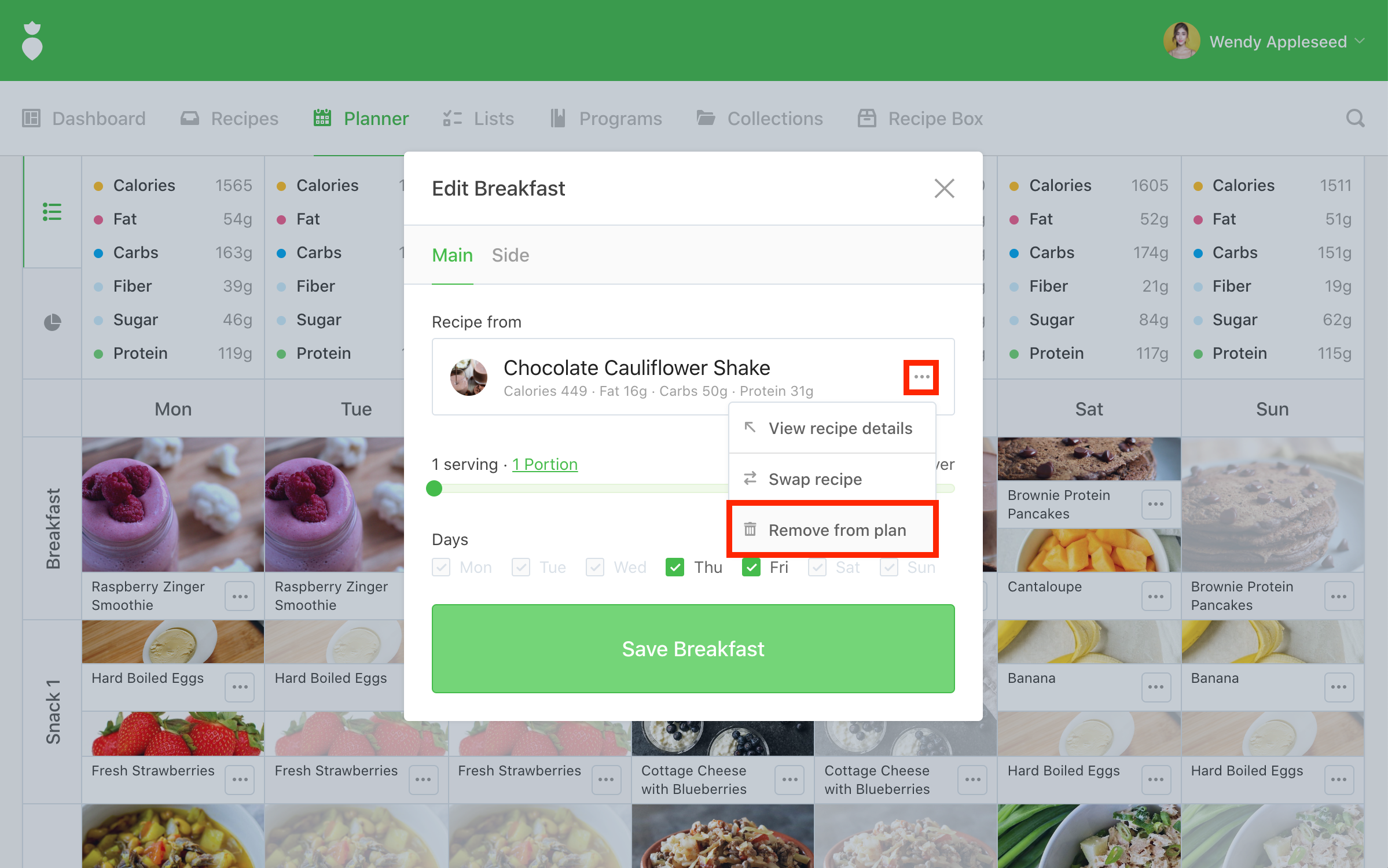 Remove from plan. Alternatively, click into any meal in which you'd like to remove, click the