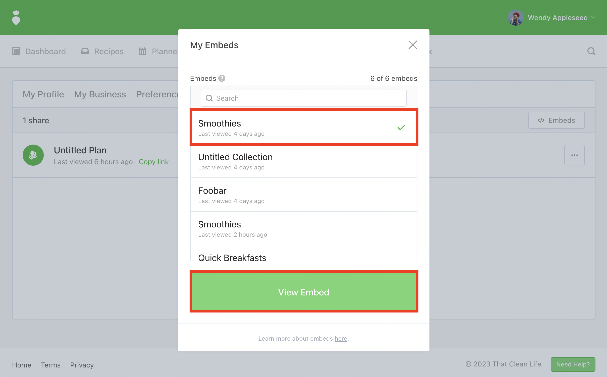 You'll see the "My Embeds" modal. Select the Embed you'd like to view the metadata for and then click the View Embed button.