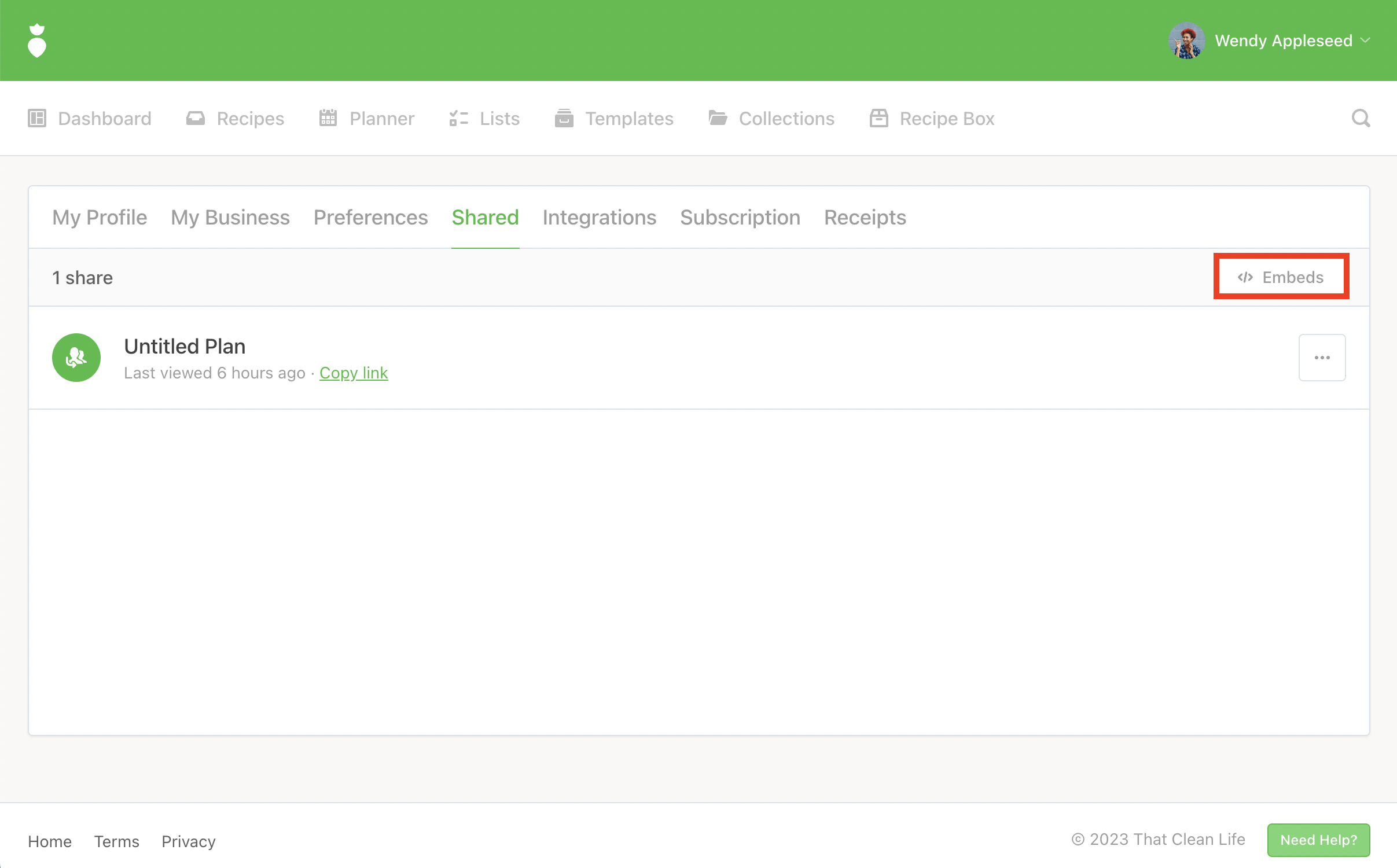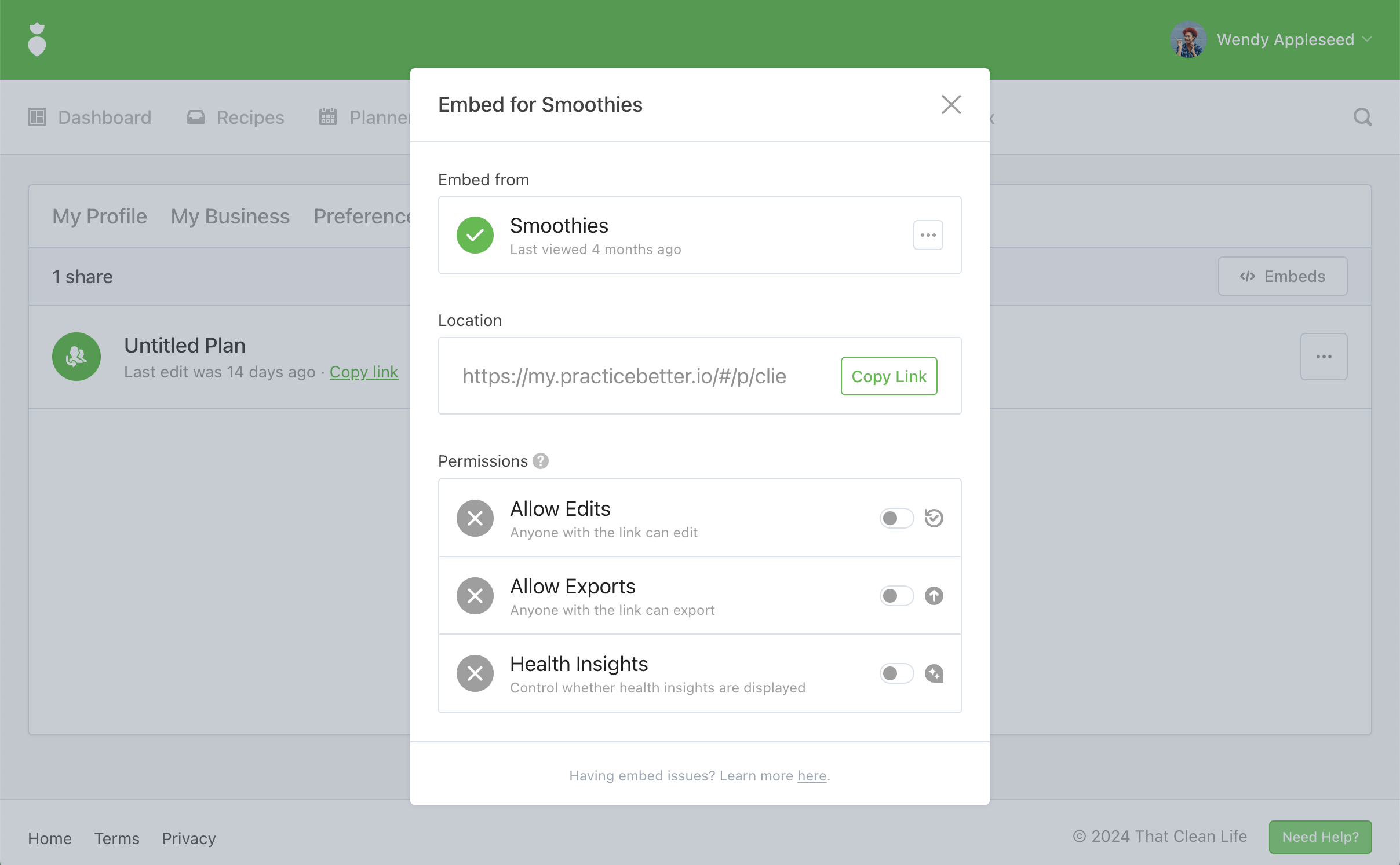 Embeds provide a more streamlined user interface similar to what you'd expect from a white-label nutrition planning experience for your clients.