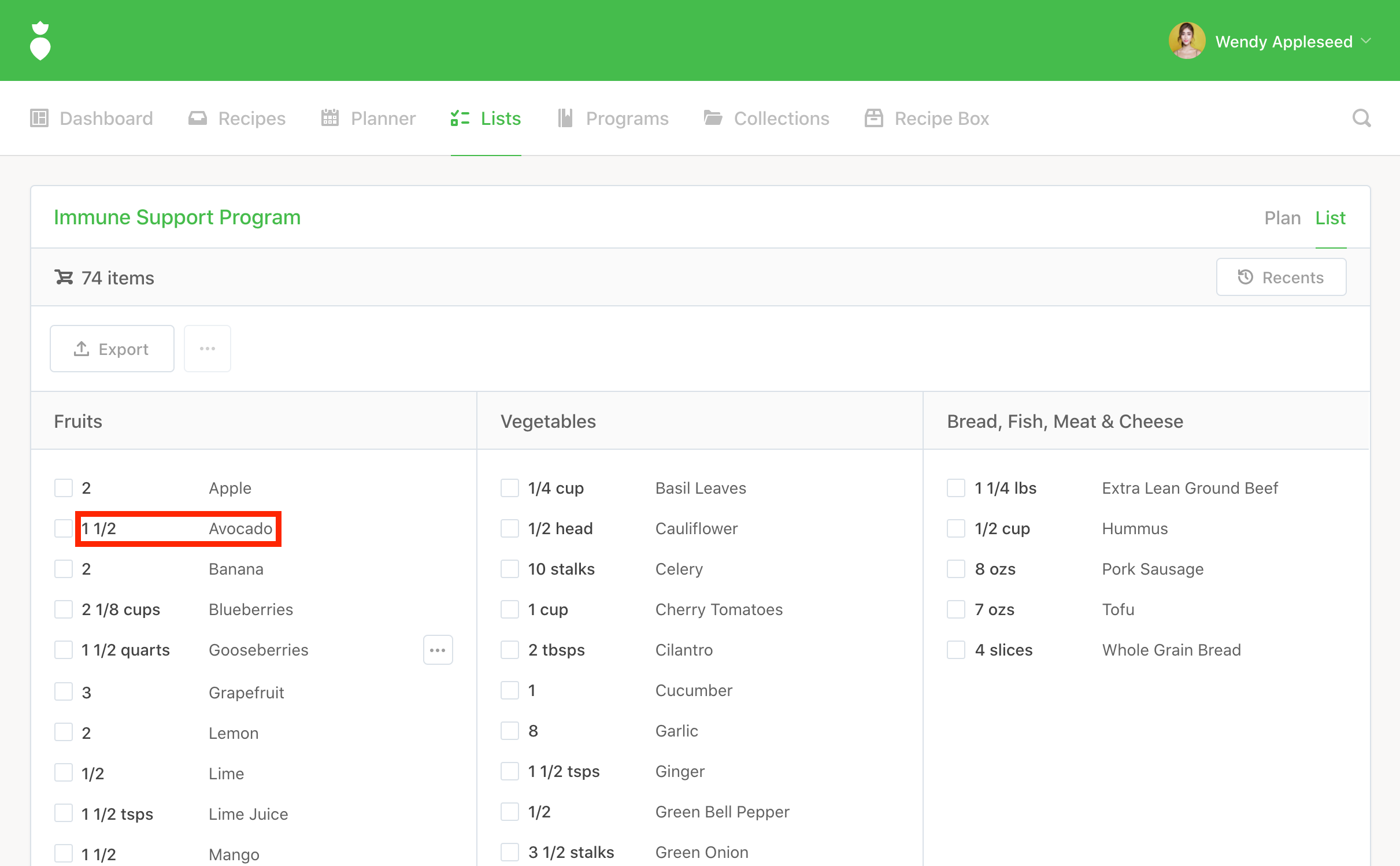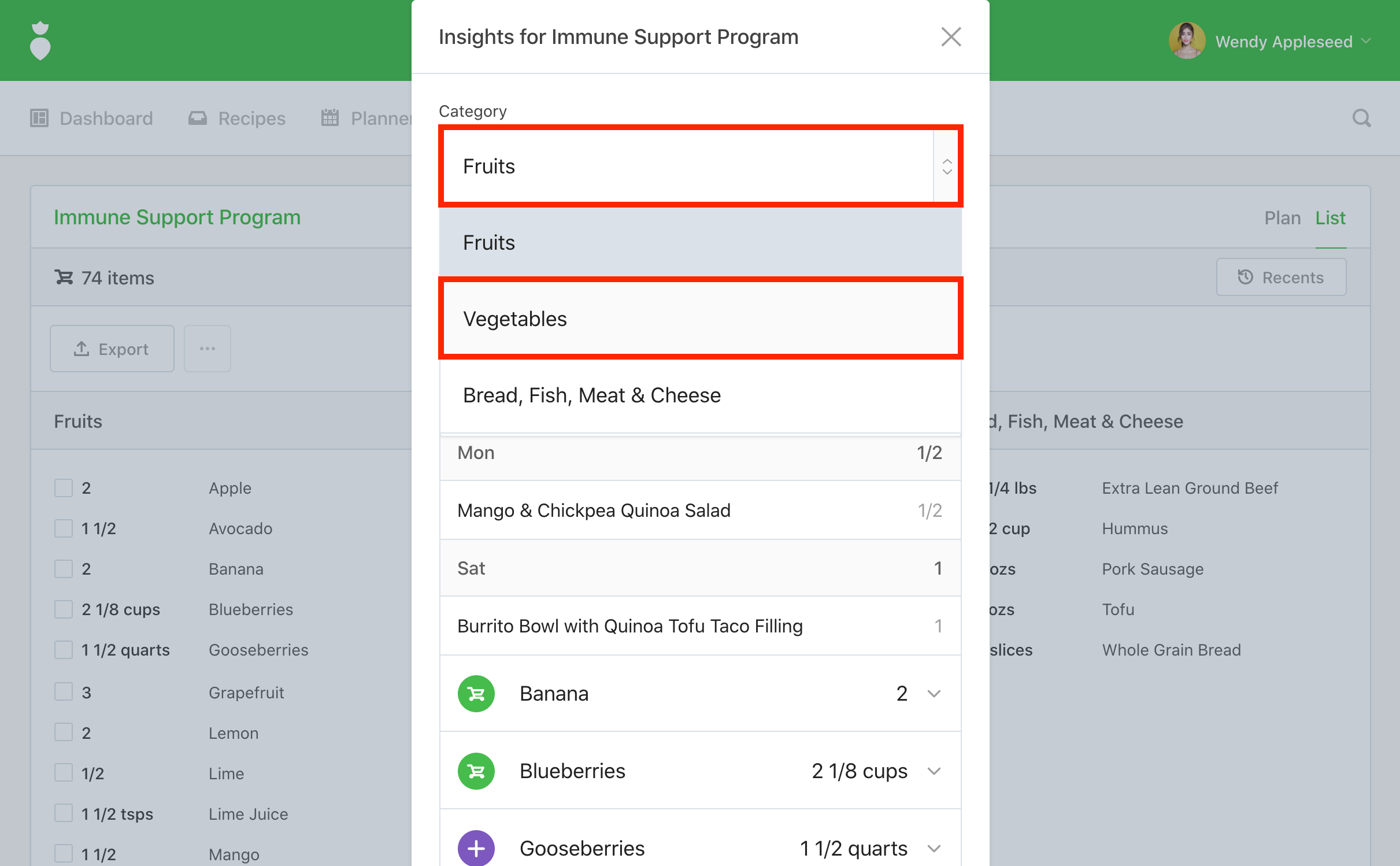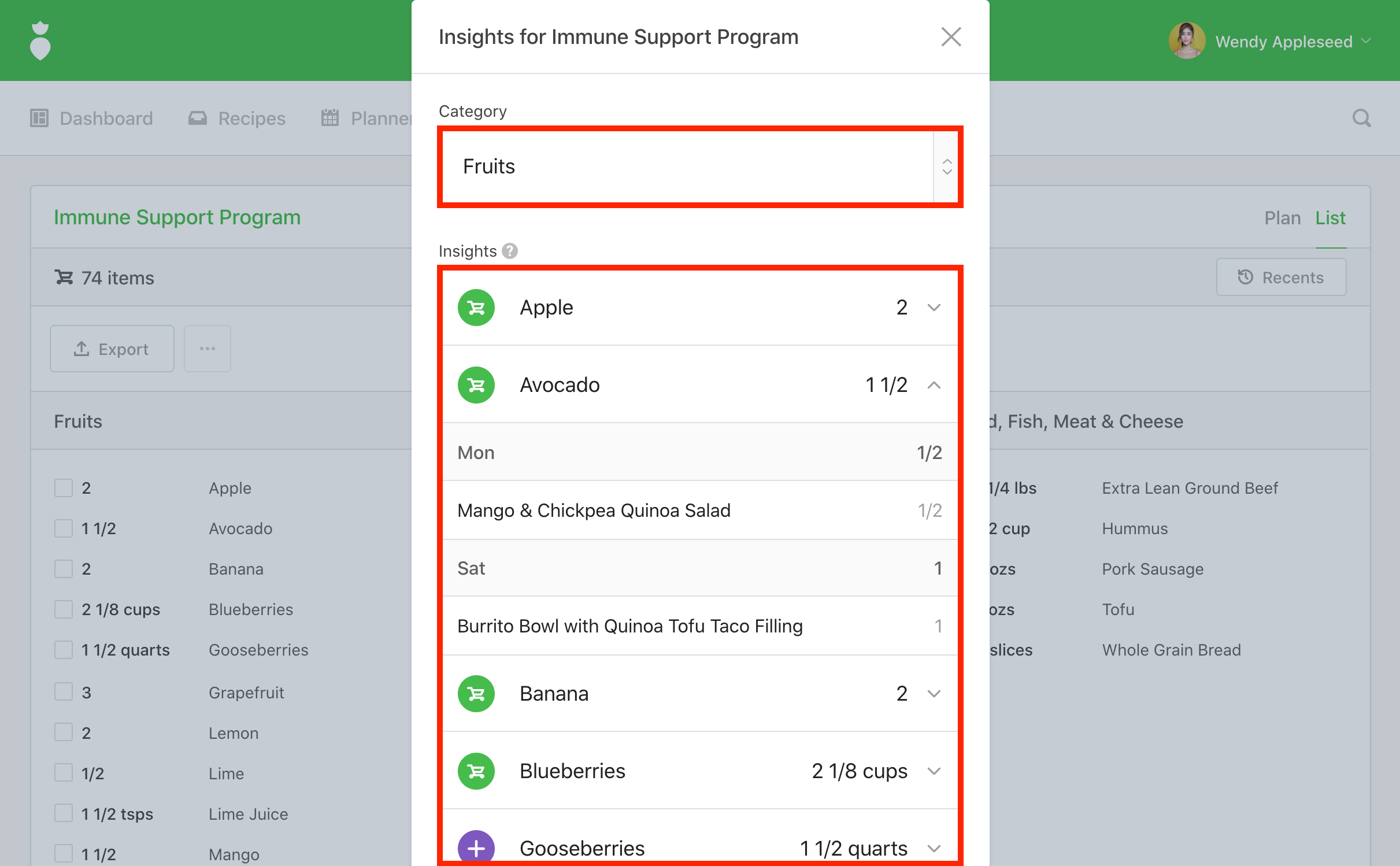 For each category we provide the total quantities of each item, coloured identifiers for custom items, per day totals, and individual recipe totals. We hope this information makes it easier to debug and balance your meal plans. - 2