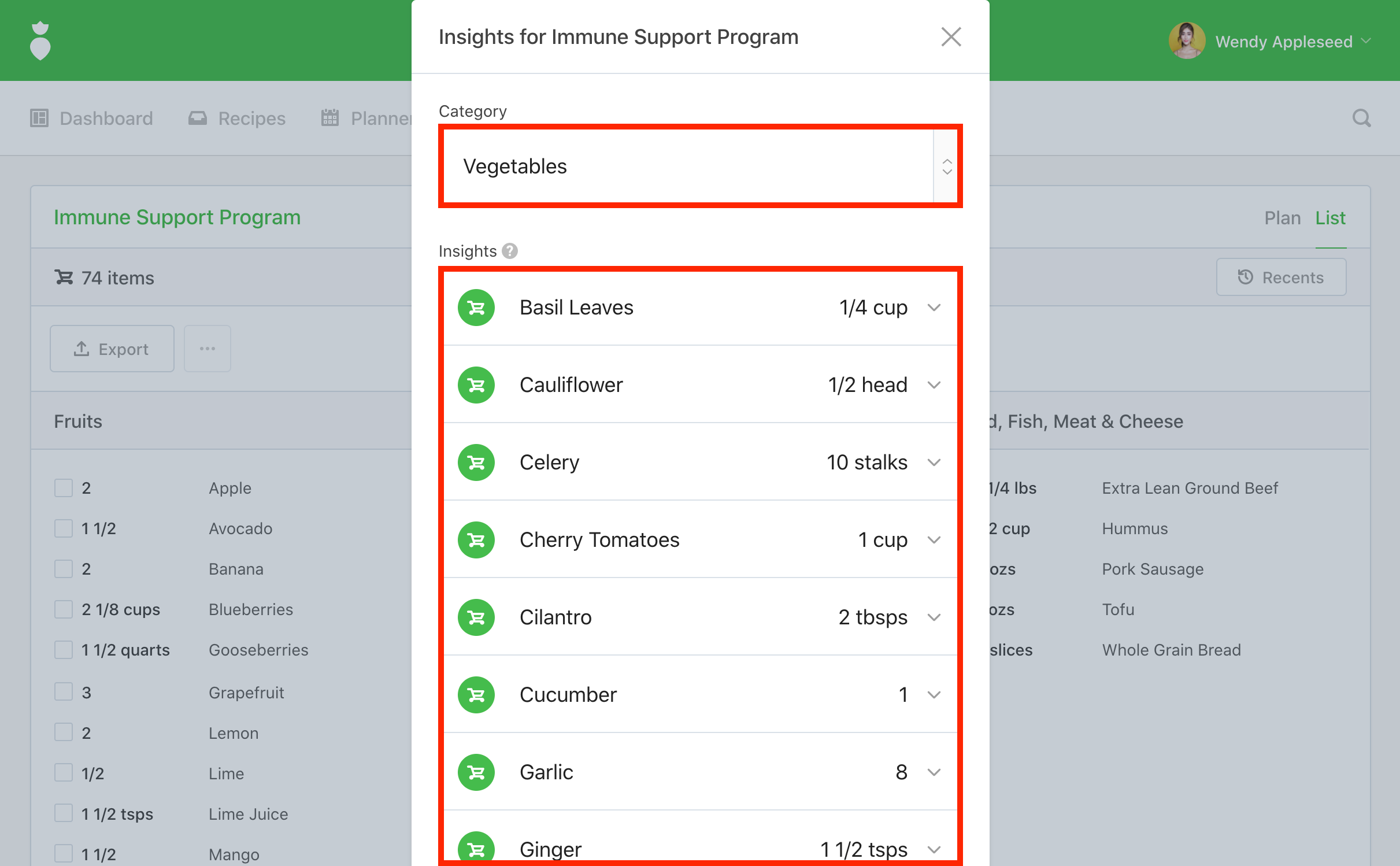 Lists, you will see items organized by category — click any item to bring up the "Insights" dialog: