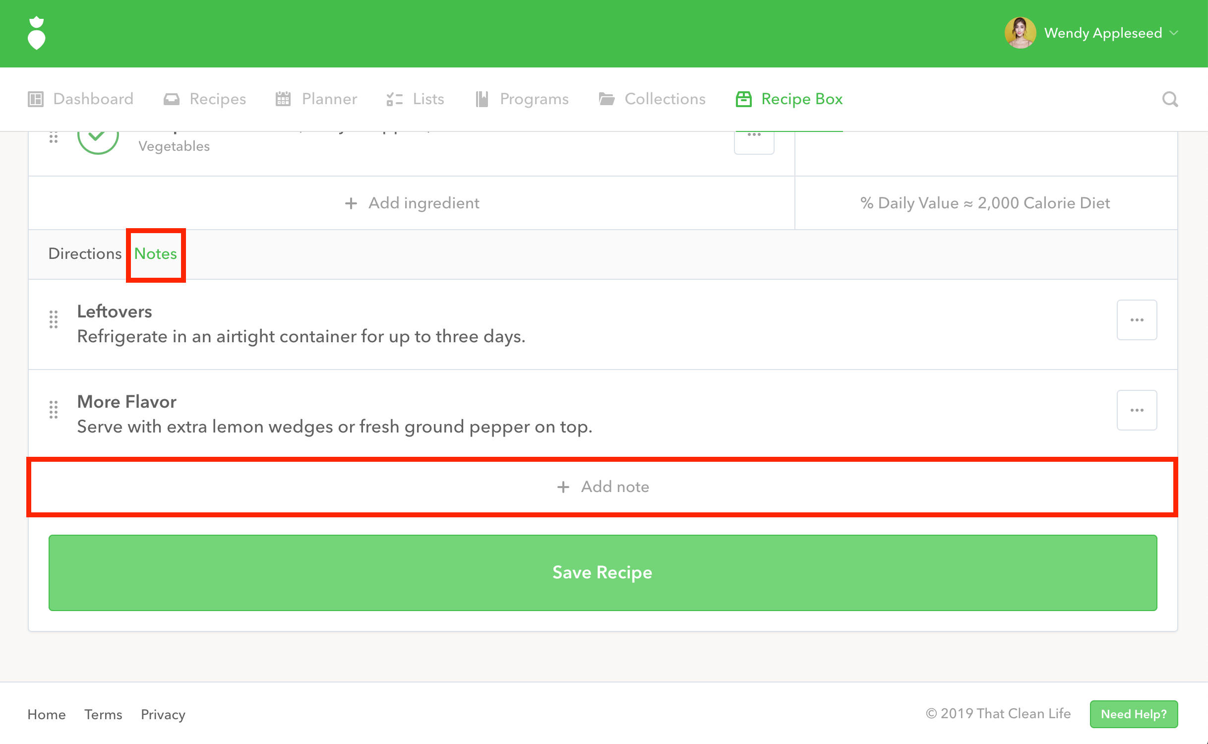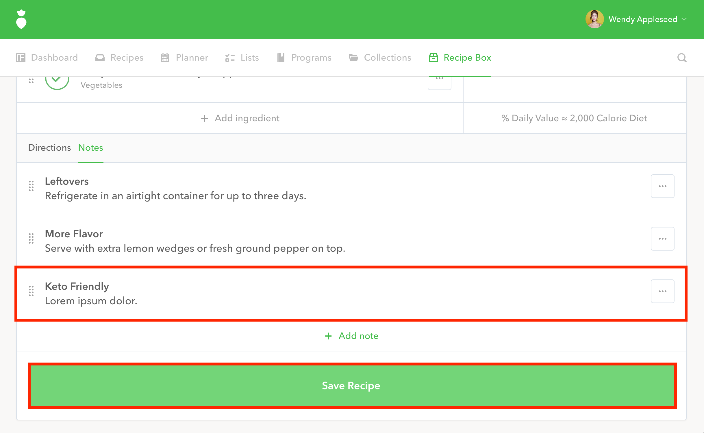 Voila! Your note has been added to your recipe. Now click the