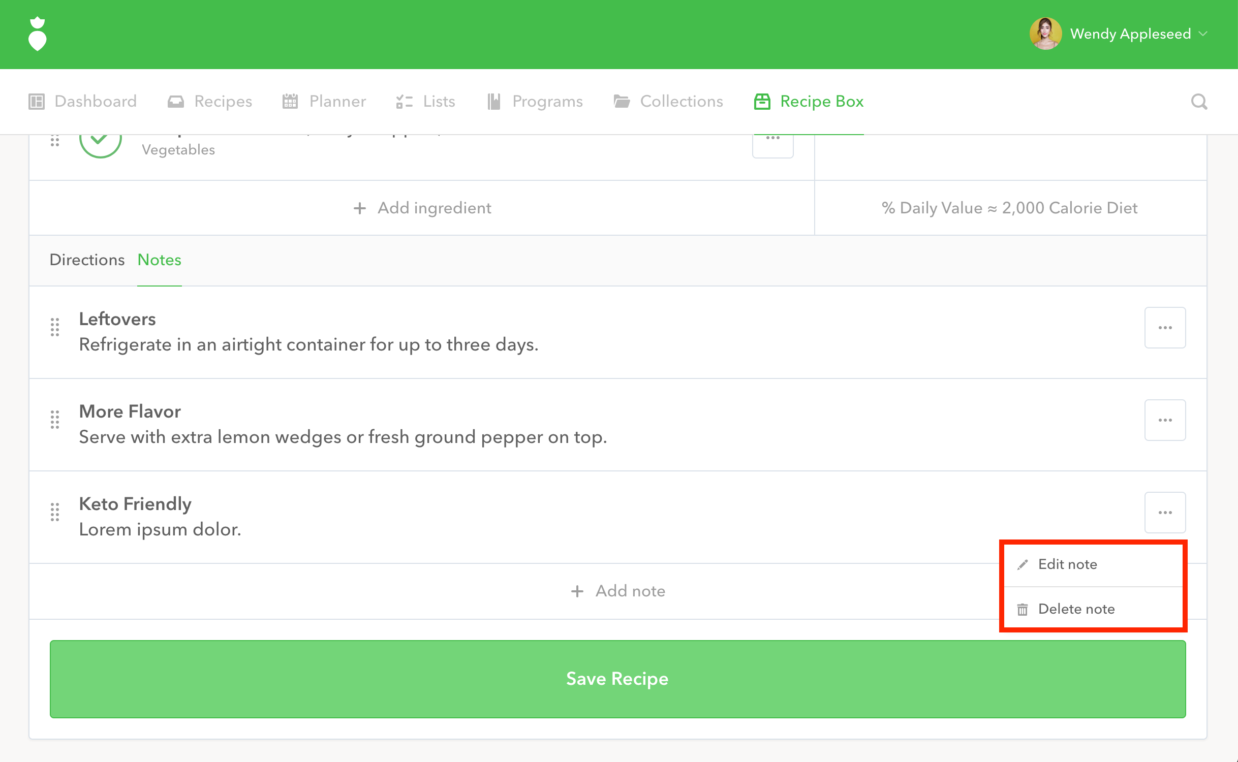Note: You can easily edit or delete a note from a recipe by clicking the ••• menu button to the right of a note and then clicking Edit note or Delete note from the context menu.