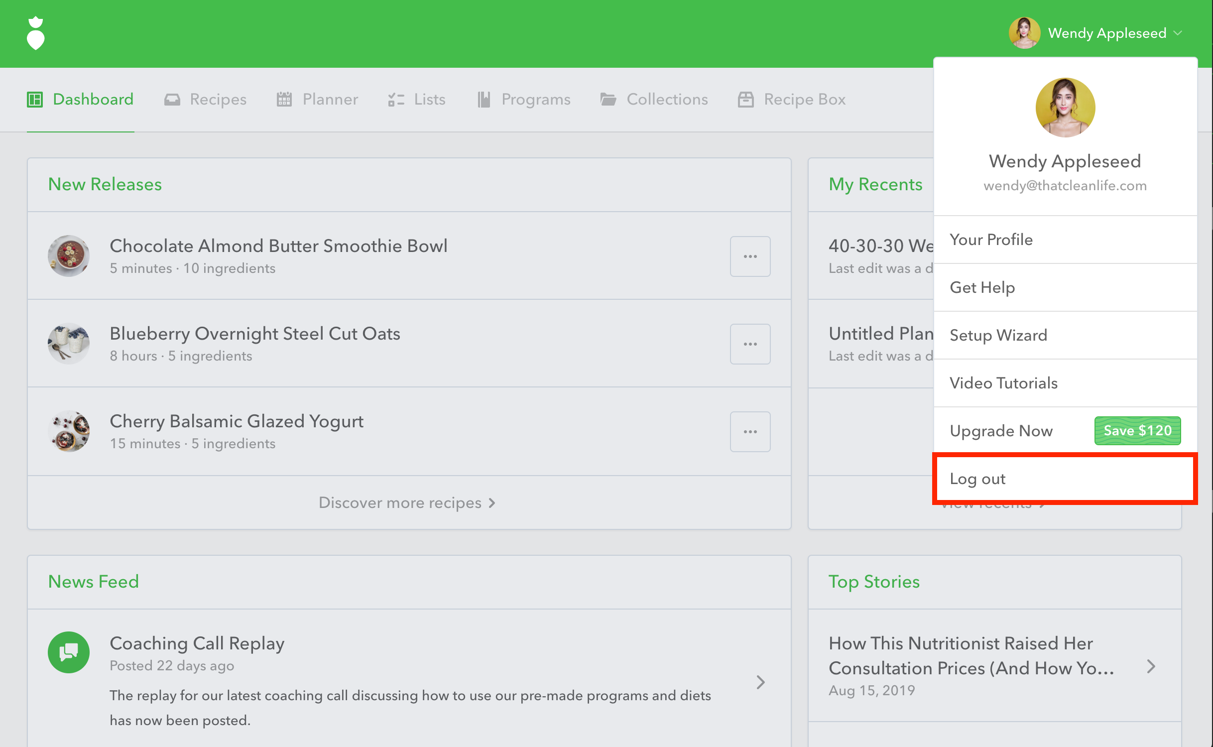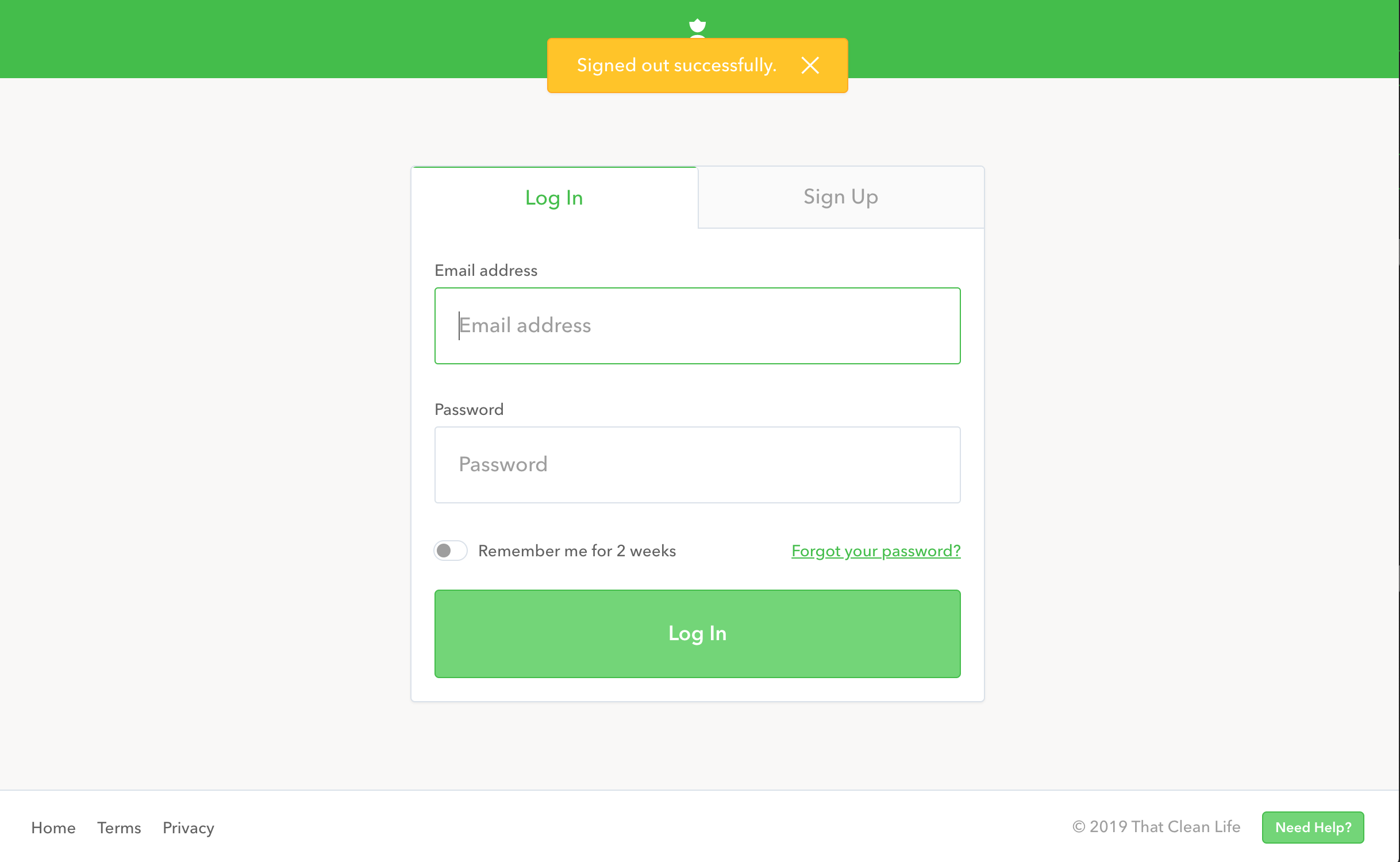 How Do I Log Out? To log out of your That Clean Life account: 1 Click on your name in the top right hand corner. 2 Click Log out link from within the dropdown menu. 3You've been successfully logged out.