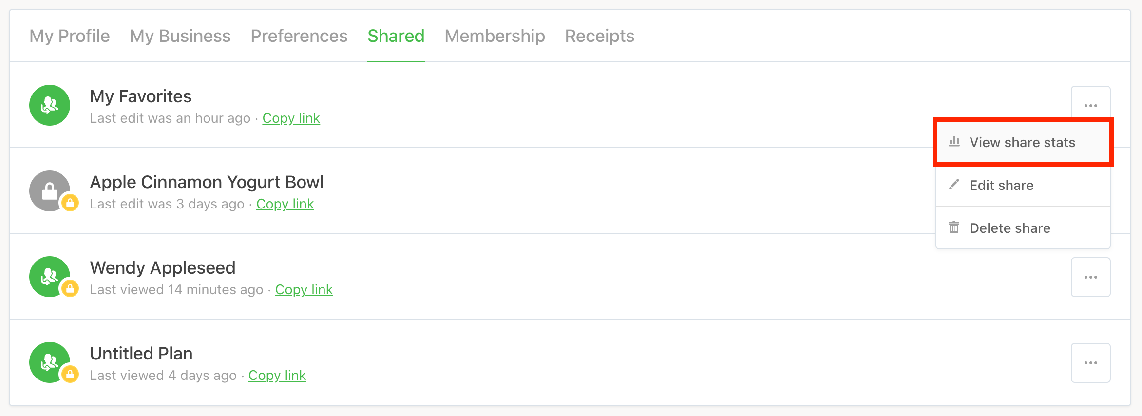 Then, click the ••• menu button to the right of the shared item in which you'd like to view the stats of and select View share stats: