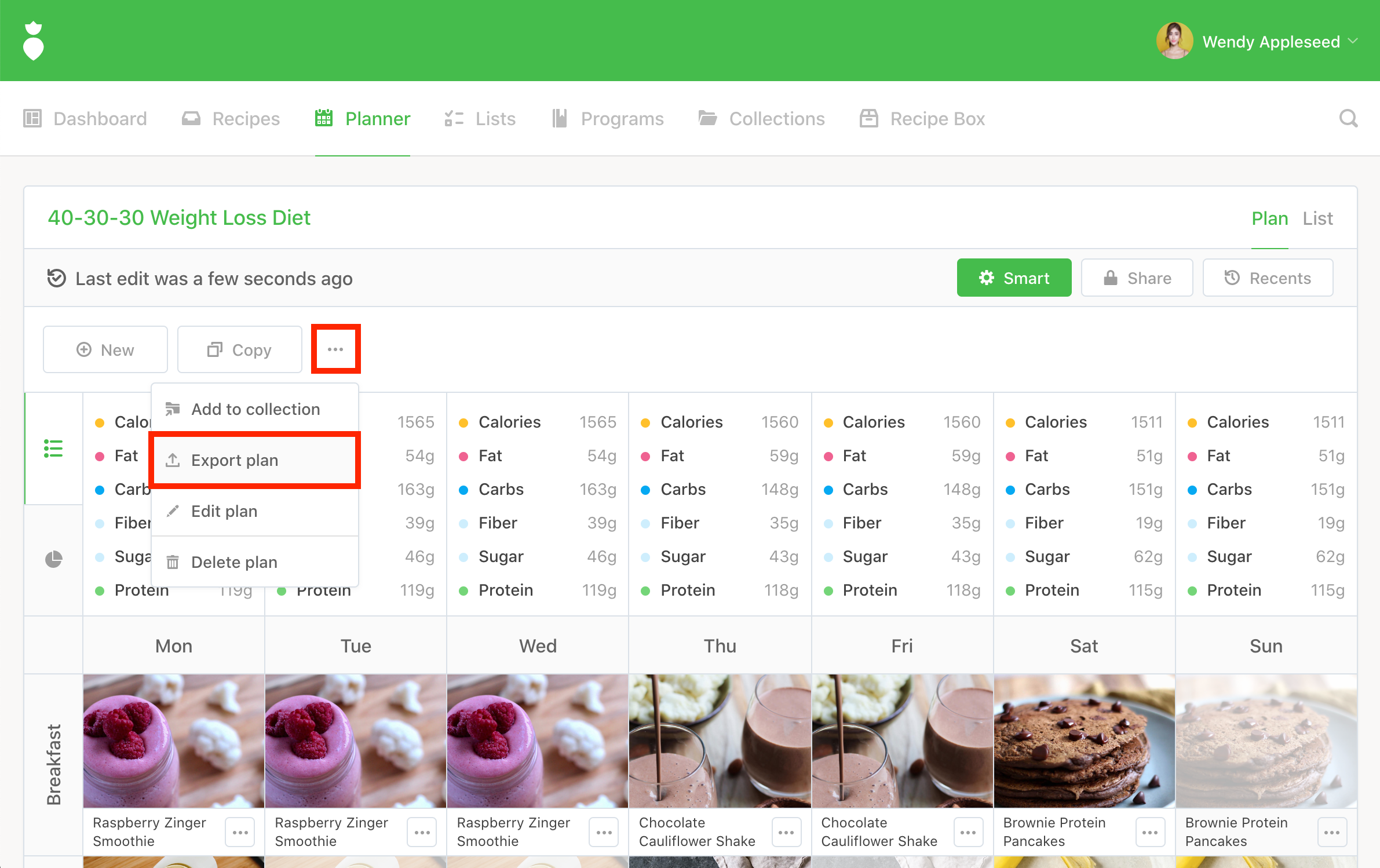 Once you've finished creating your plan and you are ready to share or export it from your Planner, click the ••• menu button and then select Export plan from the context menu: