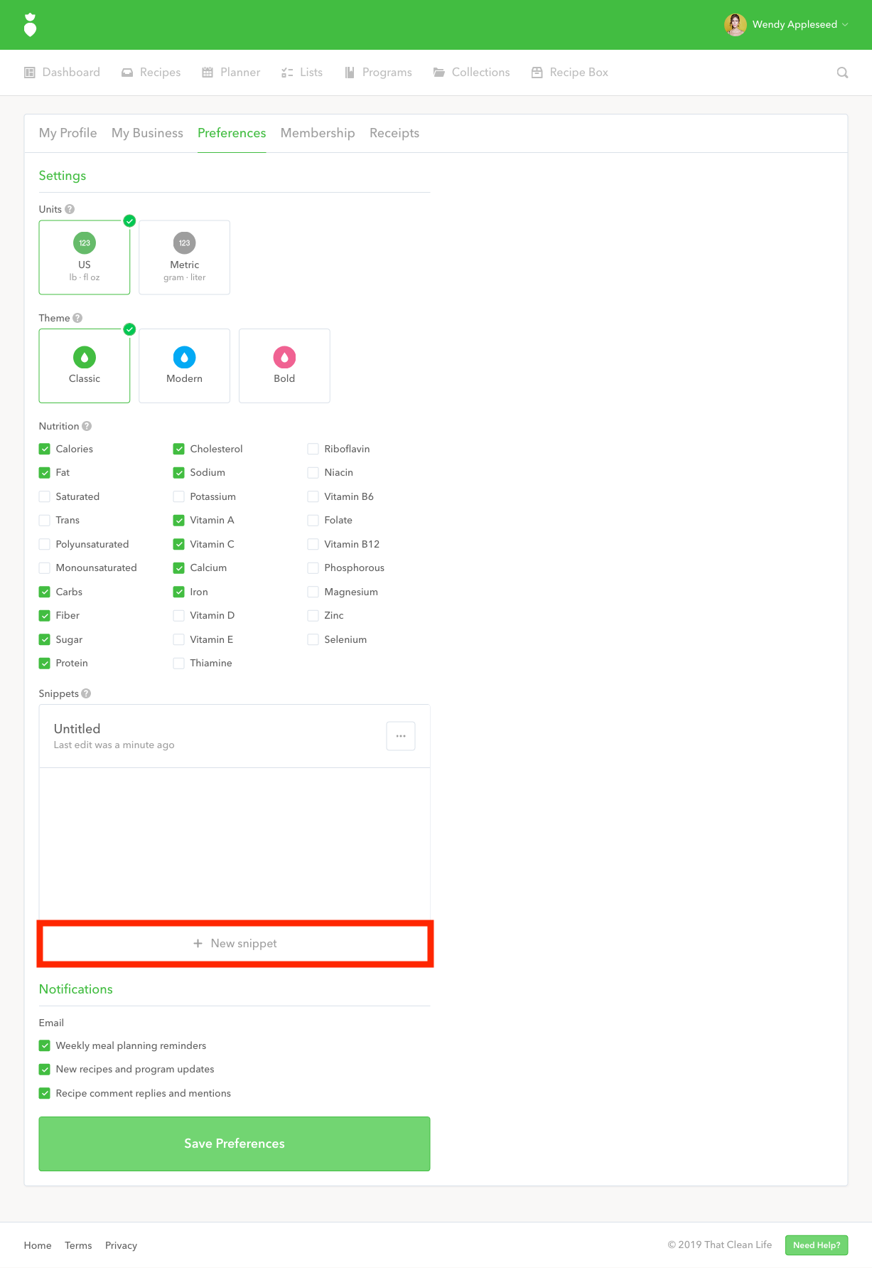 - Navigate to "Your Profile" and click on the Preferences tab. Scroll down to the section that says "Snippets".