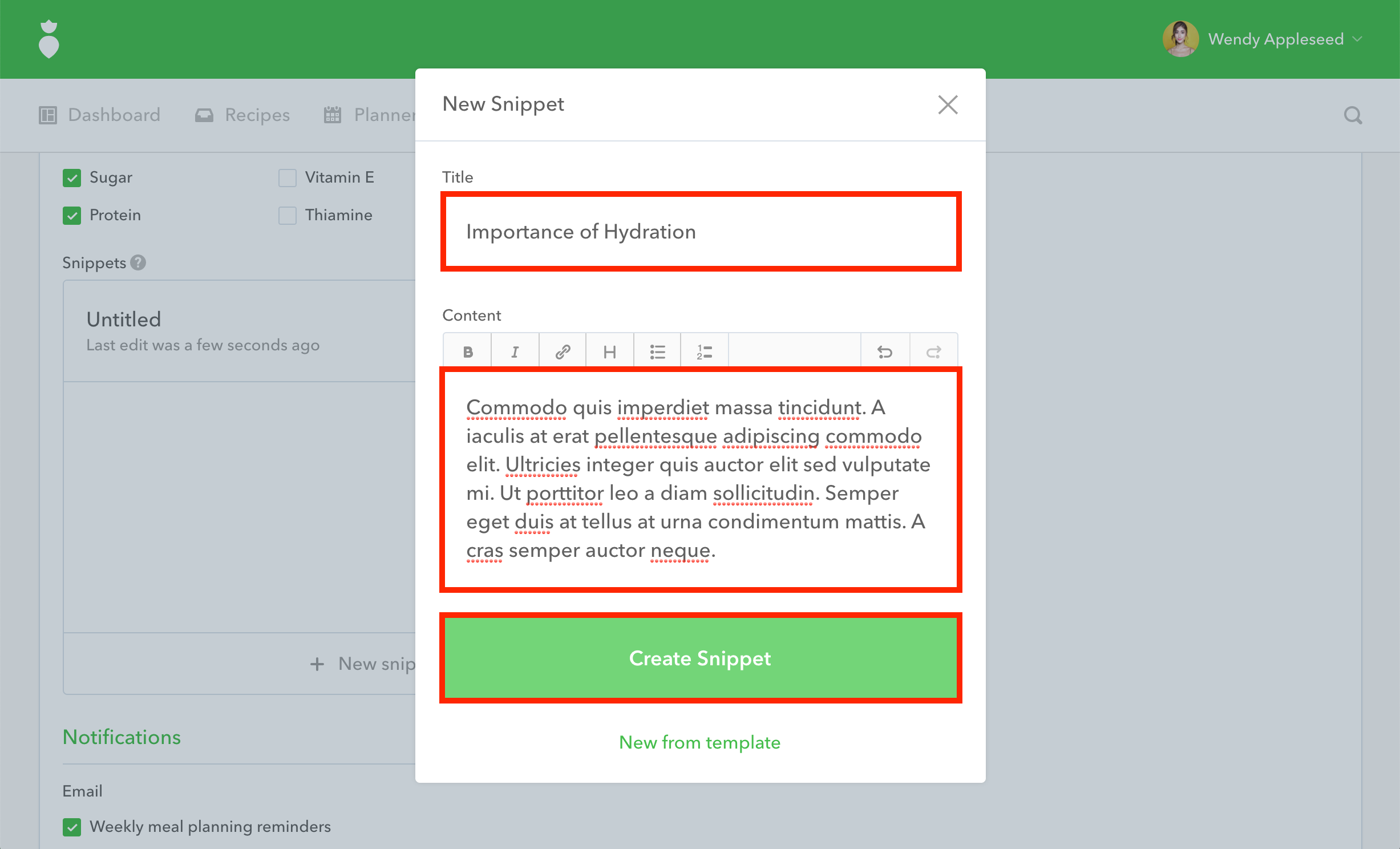 Give your Snippet a title, input the content, and click the Create Snippet button.