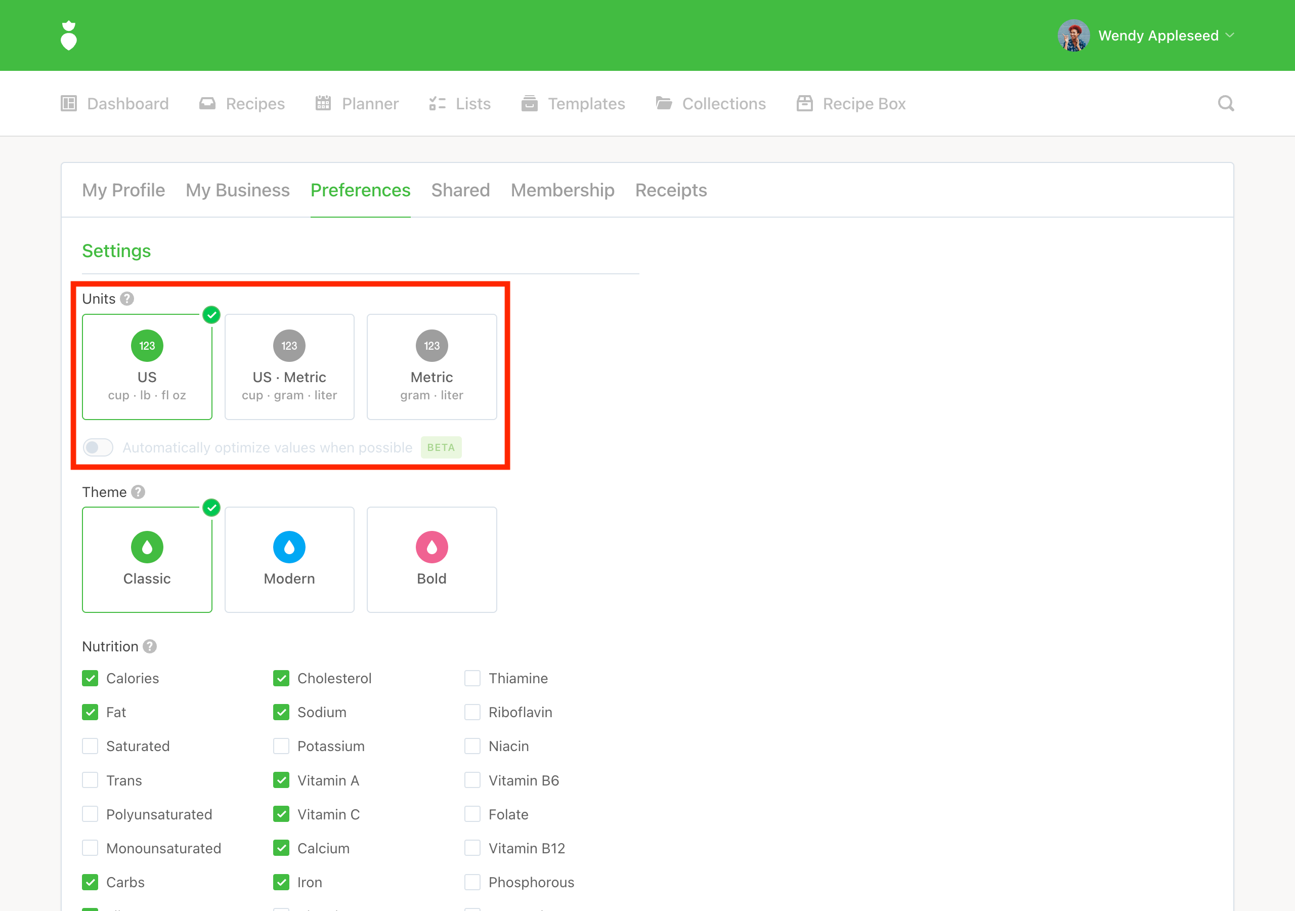 Changing your preferred "Units" will automatically convert all volume (e.g. cup ⇄ gram ⇄ milliliter), liquid volume (e.g. fl oz ⇄ milliliter), and mass (e.g. lb ⇄ gram) quantities over to your selected system of measurement.